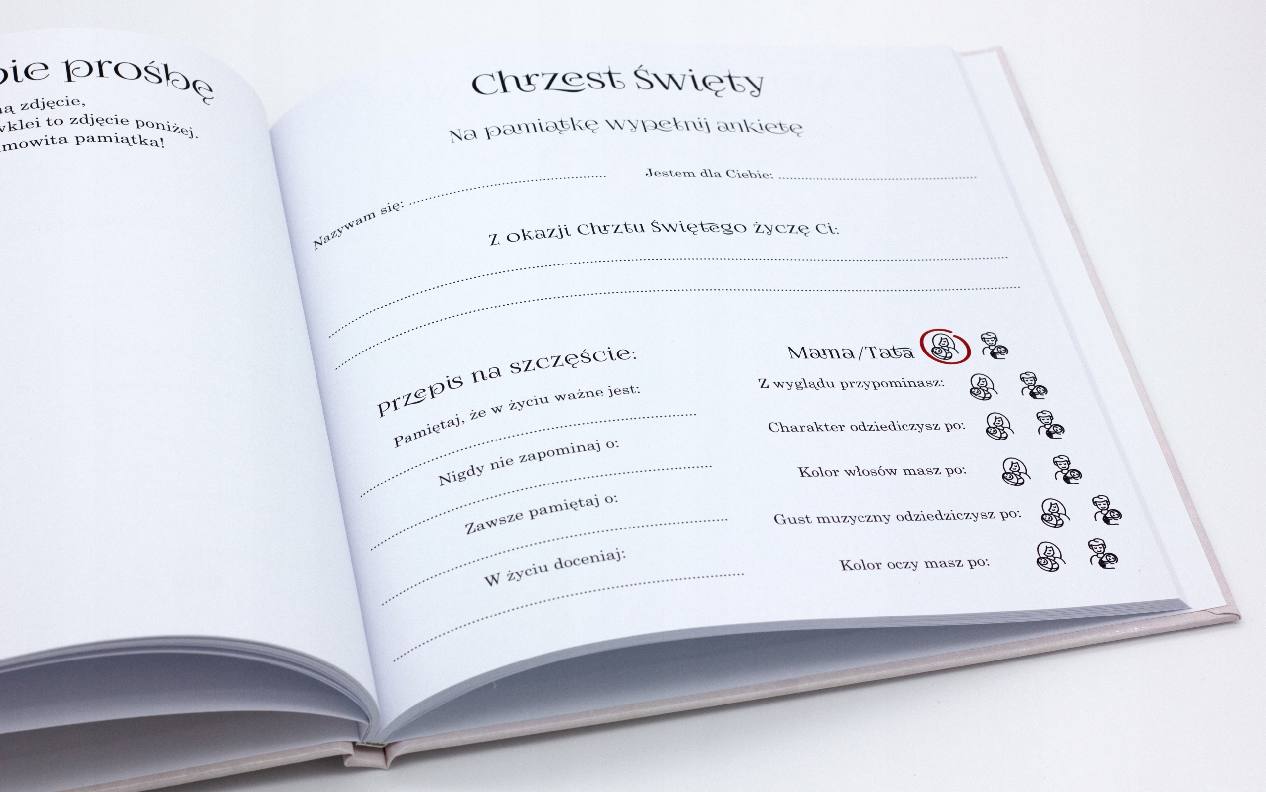 Genialna pamiątka dla dziecka - każdy gość może wpisać swoje życzenia czy rozwiązać quiz lub udzielić kilku krótkich porad na przyszłość. Prosta forma sprawi że każdy wpisze się do takiej księgi z przyjemnością. Zaskocz wszystkich niebanalnym pomysłem, a zarazem stwórz niebanalną pamiątkę do której dziecko chętnie wróci po latach.