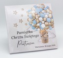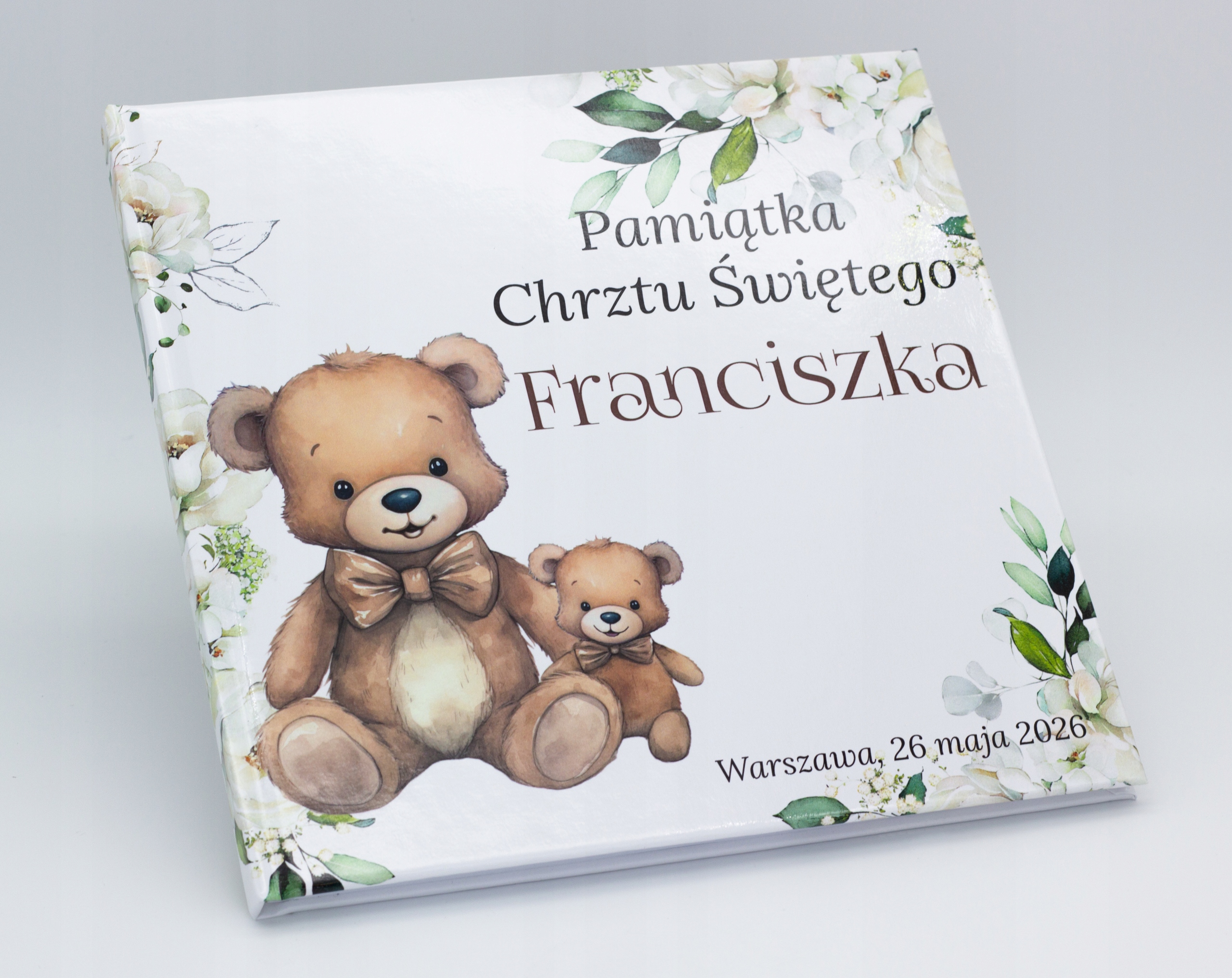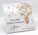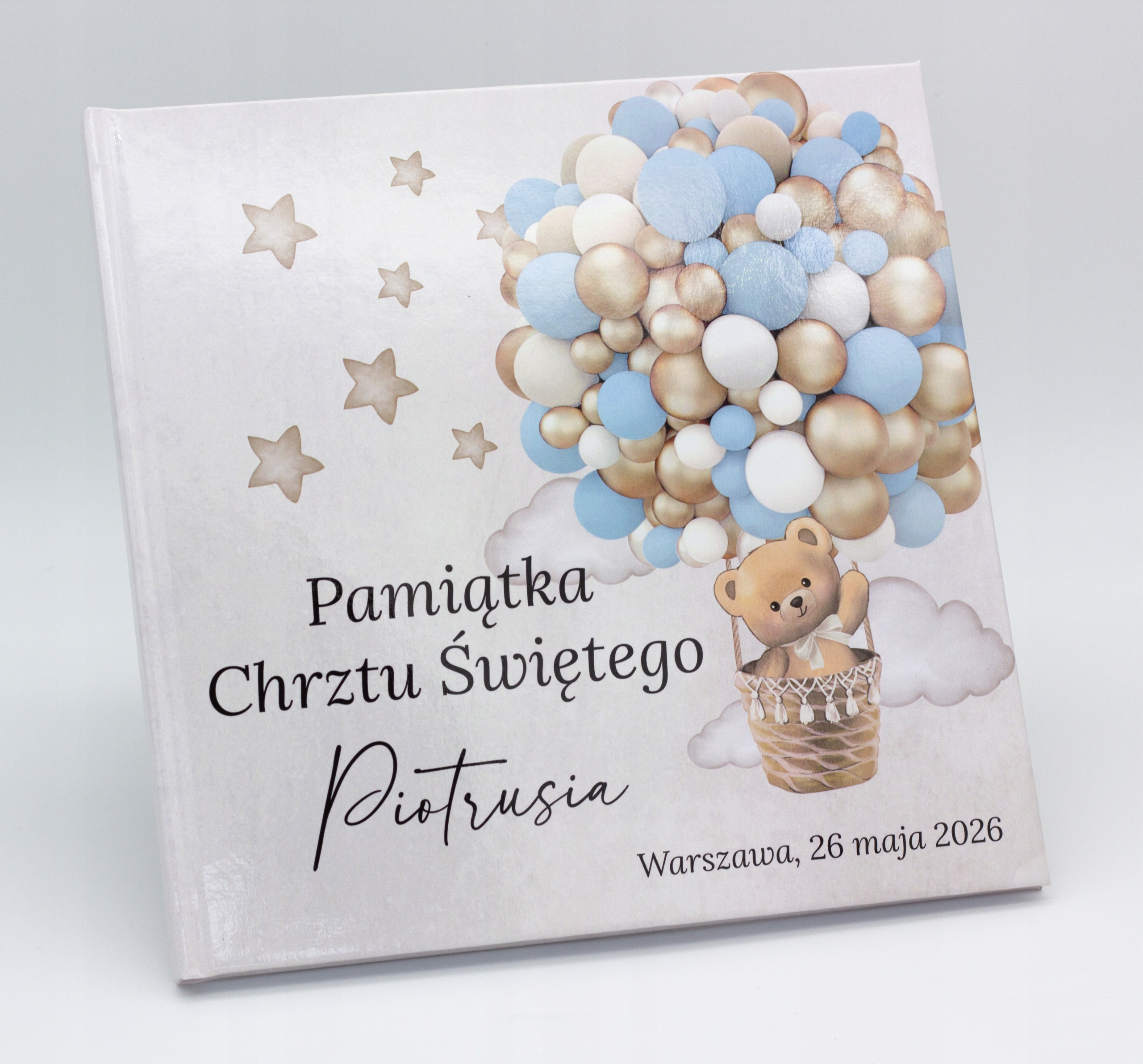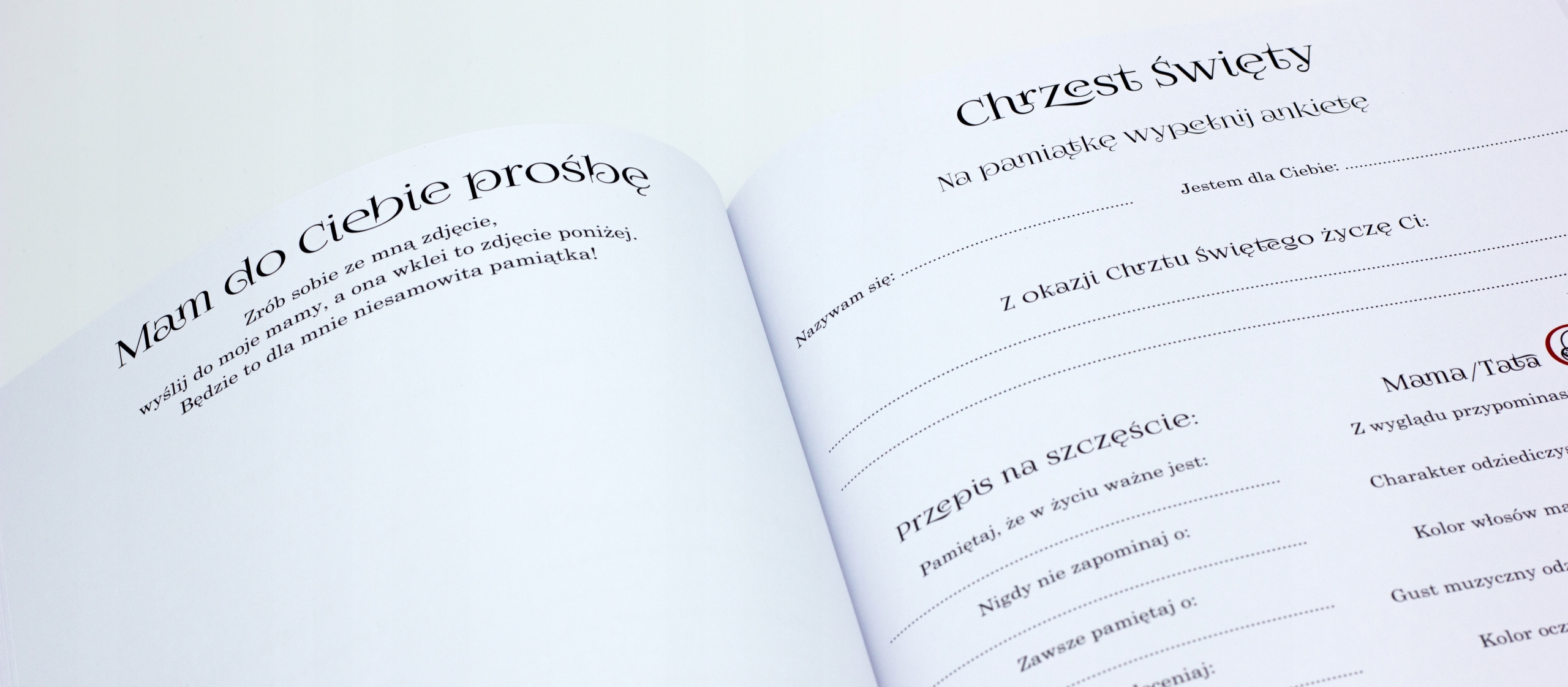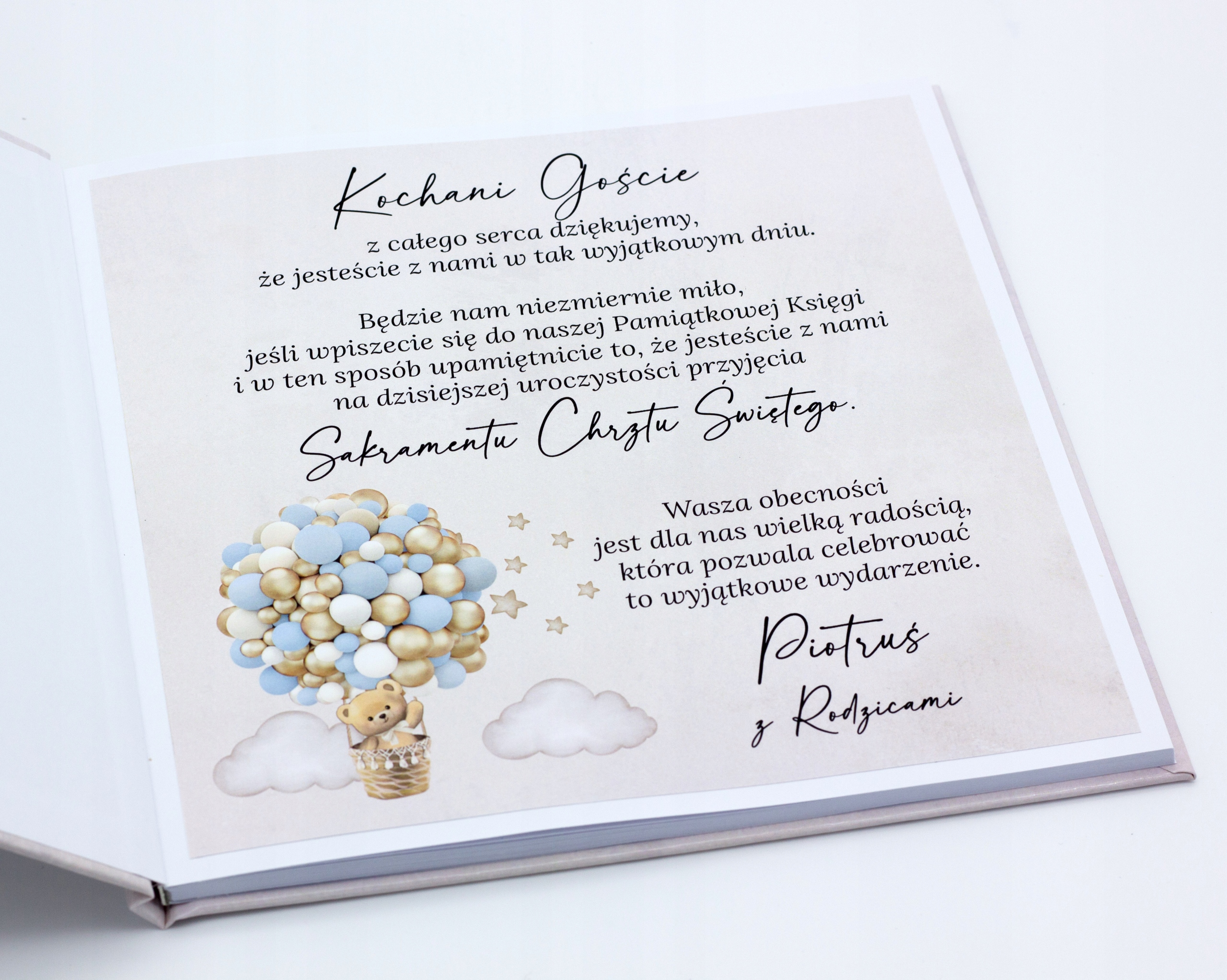Na pierwszej stronie znajduje się wklejka z podziękowaniem dla gości a także podpis dziecka, który podlega personalizacji. Podczas zamawiania można określić czy ma się tu pojawić samo imię dziecka bądź wersja ze zwrotem "z Rodzicami", "z Mamą", "z Tatą". Standardowo drukujemy wersję widoczną na zdjęciu po lewej stronie. Grafika dopasowana jest do okładki.