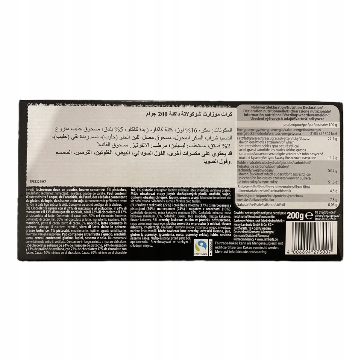 Składniki: Cukier, 16% migdały, miazga kakaowa, tłuszcz kakaowy, 5% orzechy laskowe, mleko w proszku odtłuszczone syrop cukru inwertowanego, słodka serwatka w proszku (z mleka), tłuszcz mleczny, 1% pistacje, emulgator: lecytyny: środek utrzymujący wilgoć: inwertaza; mielona laska wanili. Może zawierać inne orzechy, orzeszki ziemne, jaja, gluten (z pszenicy, jęczmienia, owsa, pszenicy orkisz), lubin, nasiona sezamu i soje.