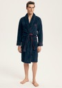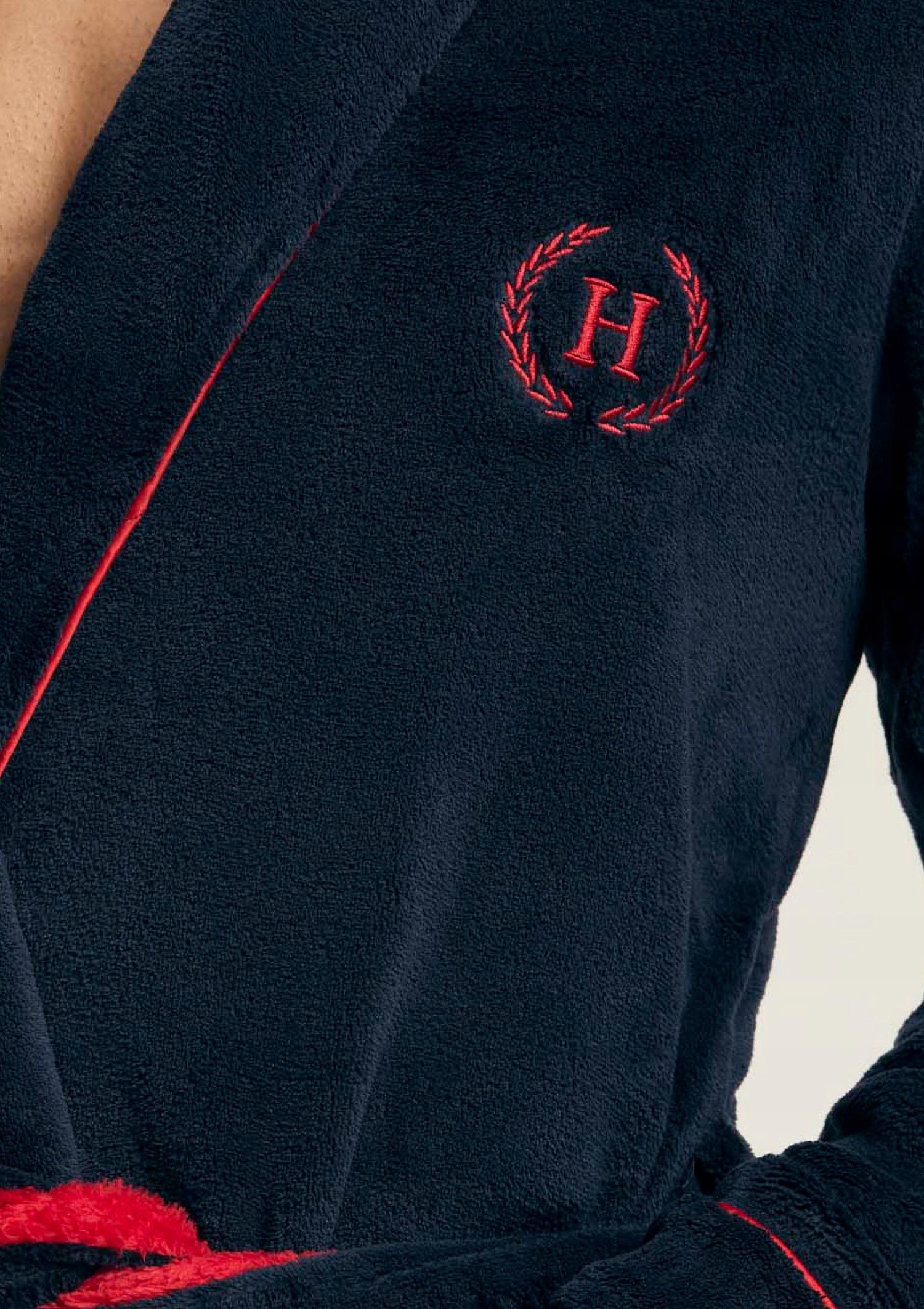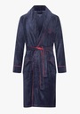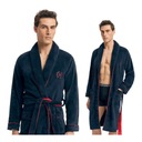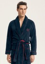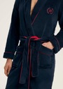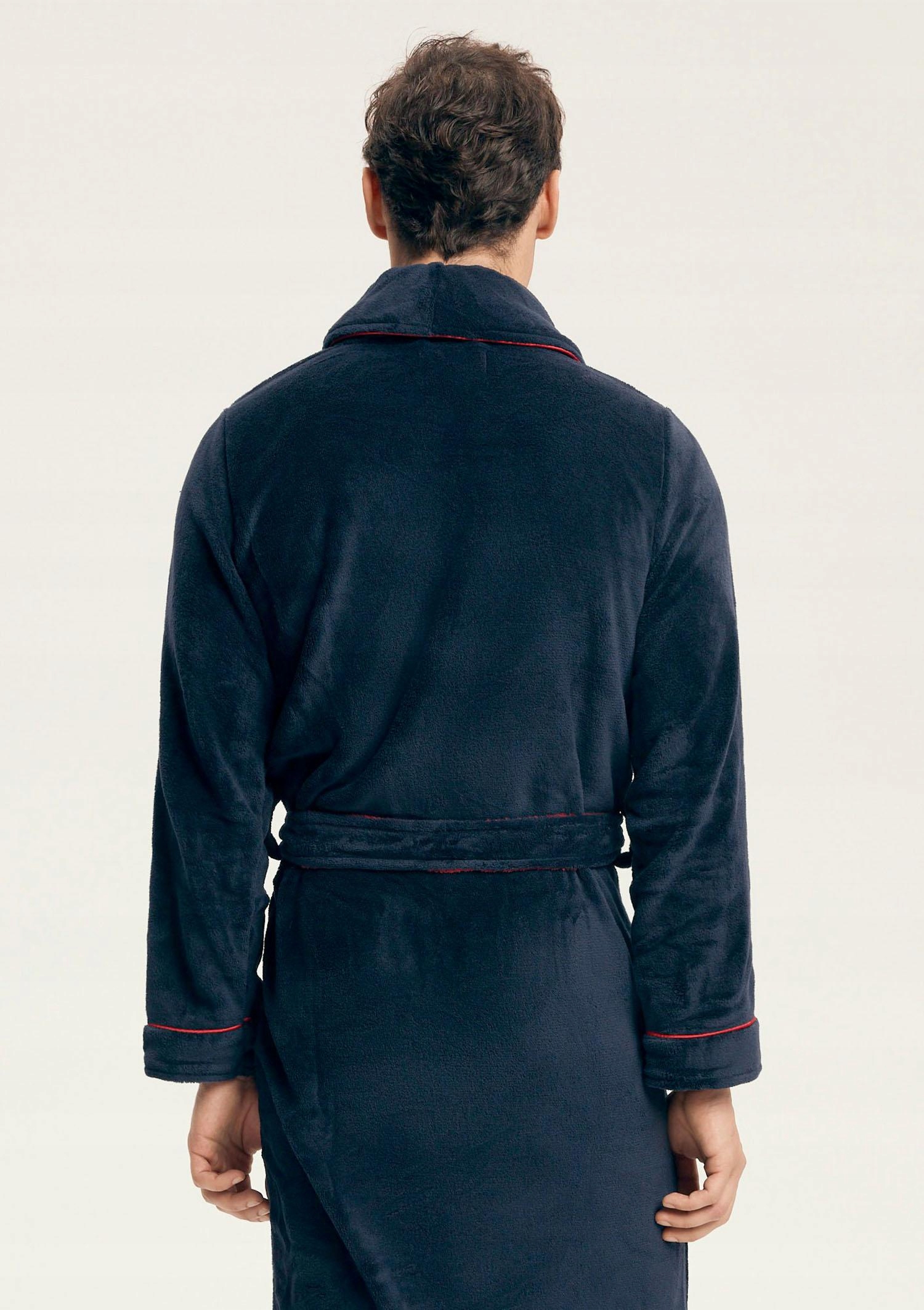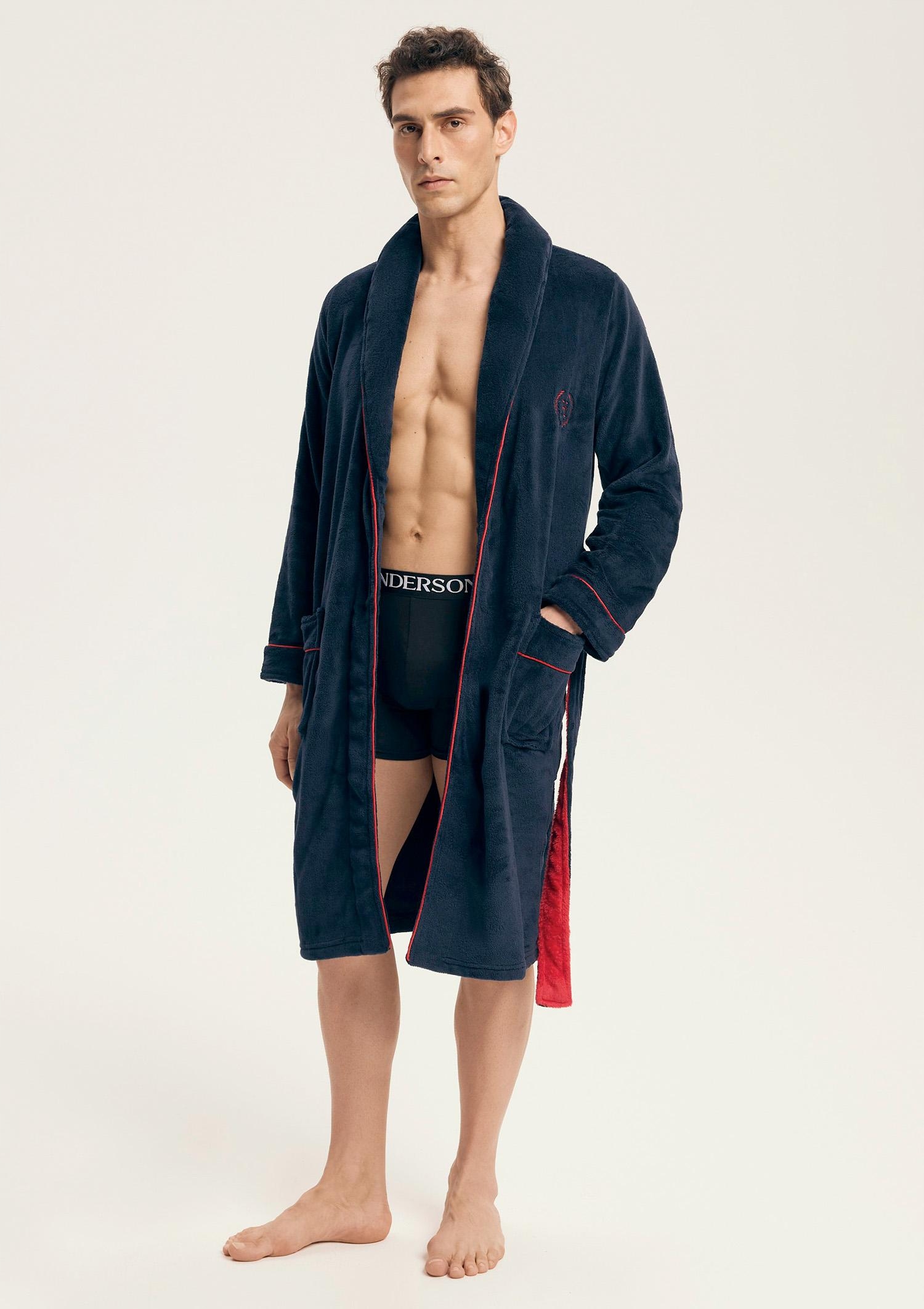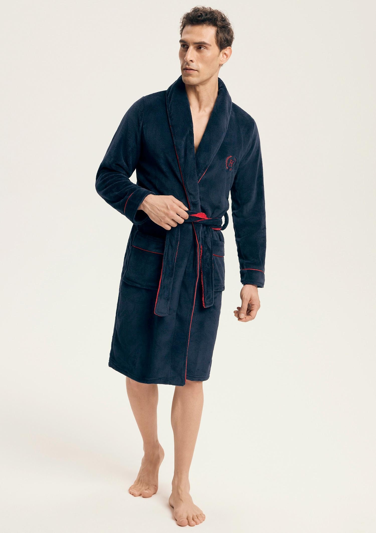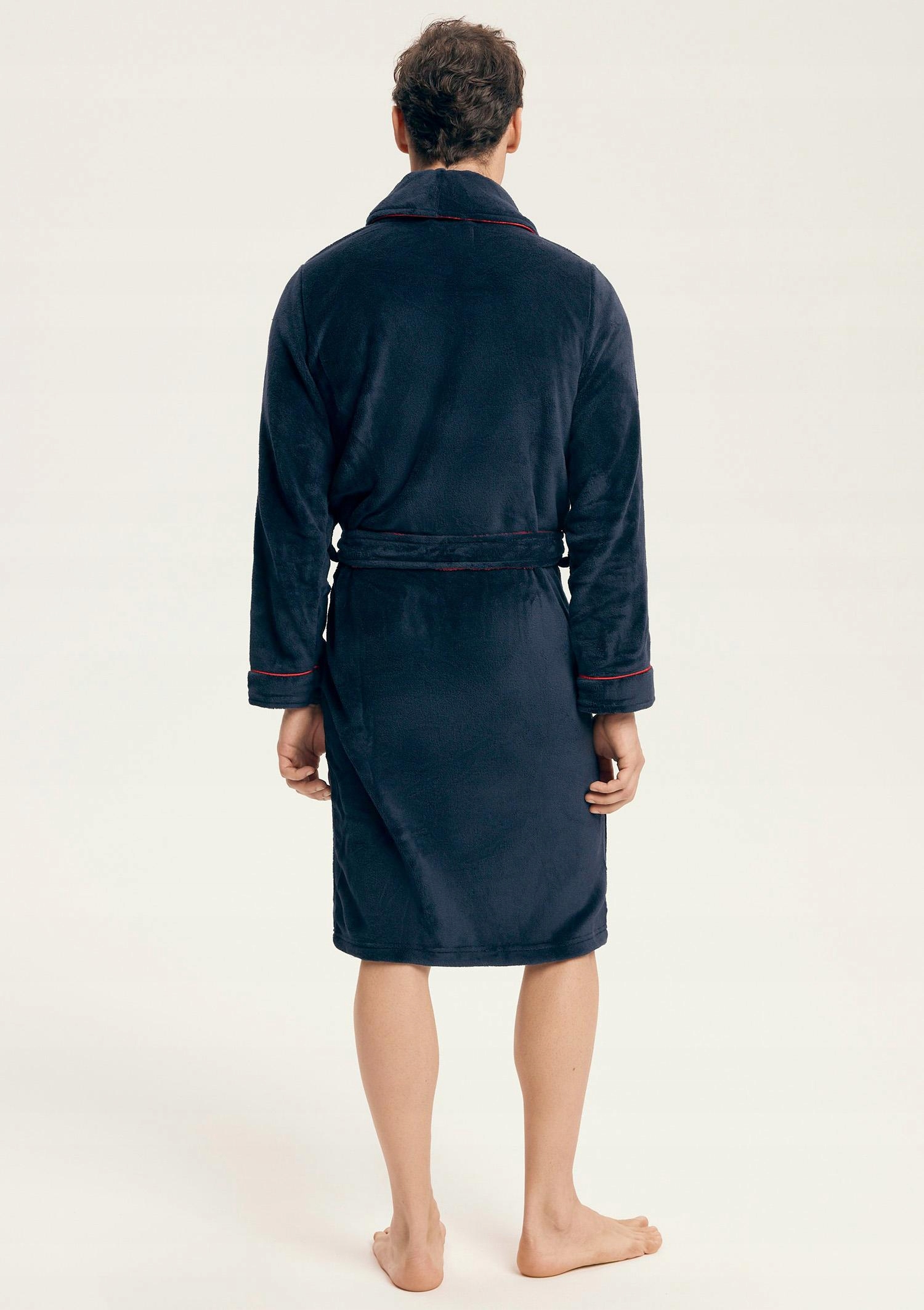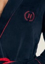 Miękka, gruba welurowa mikrofibra przyjemnie otula i szybko schnie po kąpieli. Klasyczny krój do kolan z szerokim kołnierzem zapewnia swobodę i komfort cieplny, a pasek w talii i dwie pojemne kieszenie dodają funkcjonalności. Granat przełamany czerwoną lamówką i haftem logo to stylowy akcent na co dzień i w podróży.