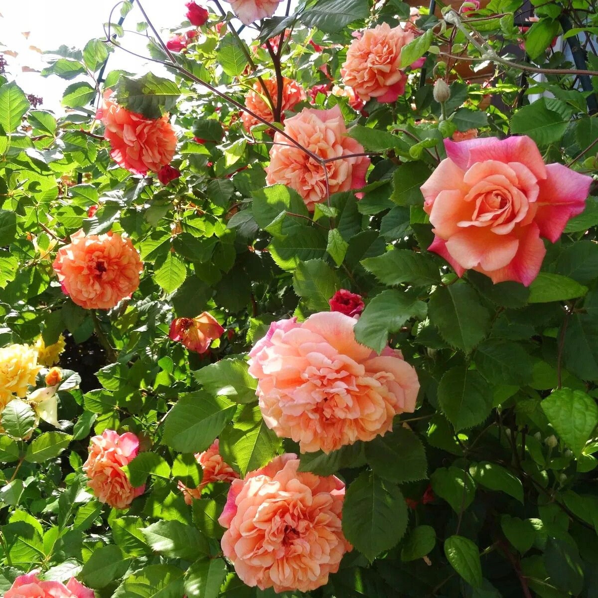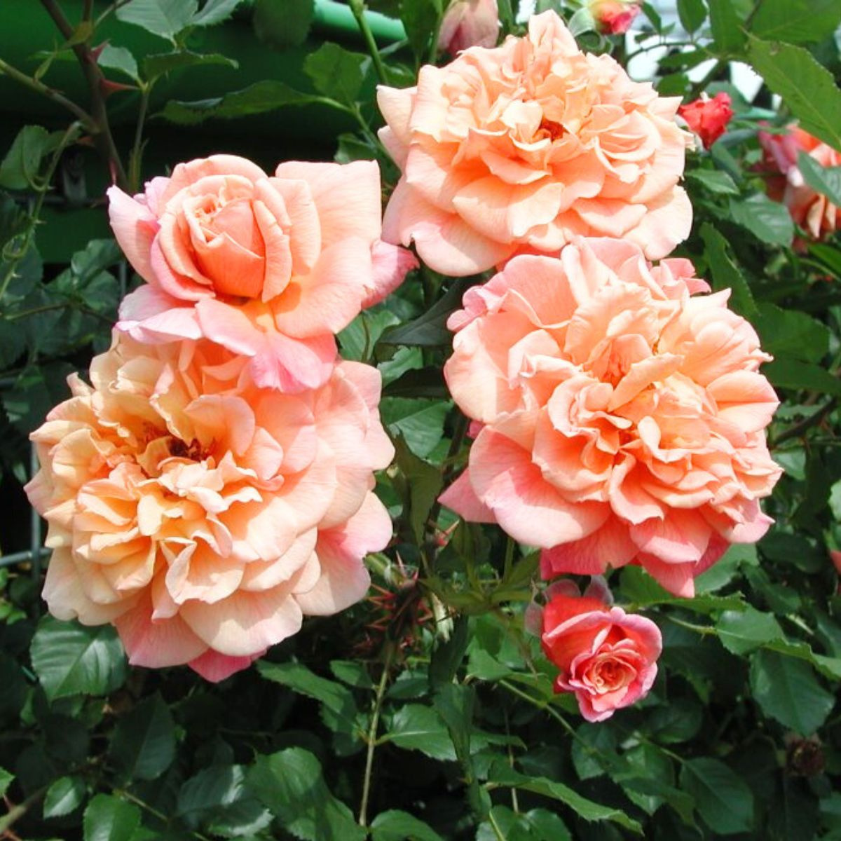 Kwiaty: Duże (10–12 cm), pełne, o szlachetnej formie i niezwykłej barwie – połączenie morelowego, łososiowego i różowego koloru, który zmienia odcień w zależności od światła. Zebrane w grona po kilka sztuk, długo utrzymują świeżość na pędach.