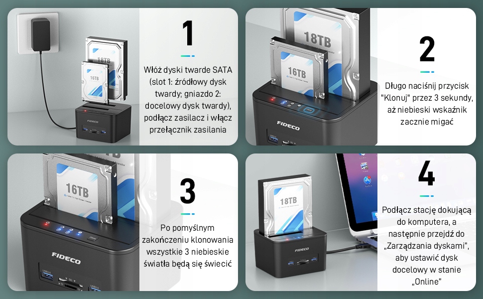 Stacja dokująca do dysków twardych FIDECO jest kompatybilna z 2,5- i 3,5-calowymi dyskami twardymi/SSD SATA.