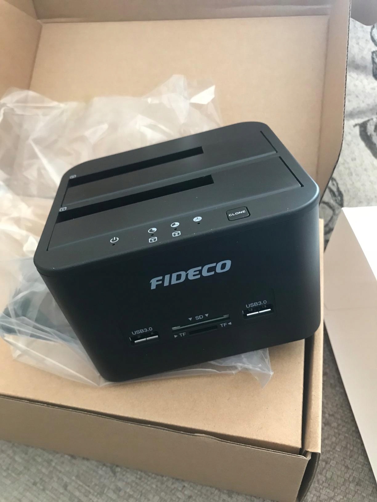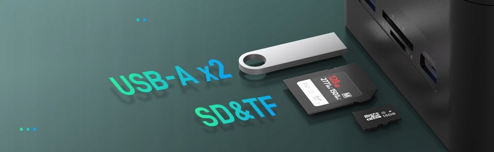 Stacja dokująca FIDECO posiada również 2 porty USB 3.0 i gniazda kart TF i SD.