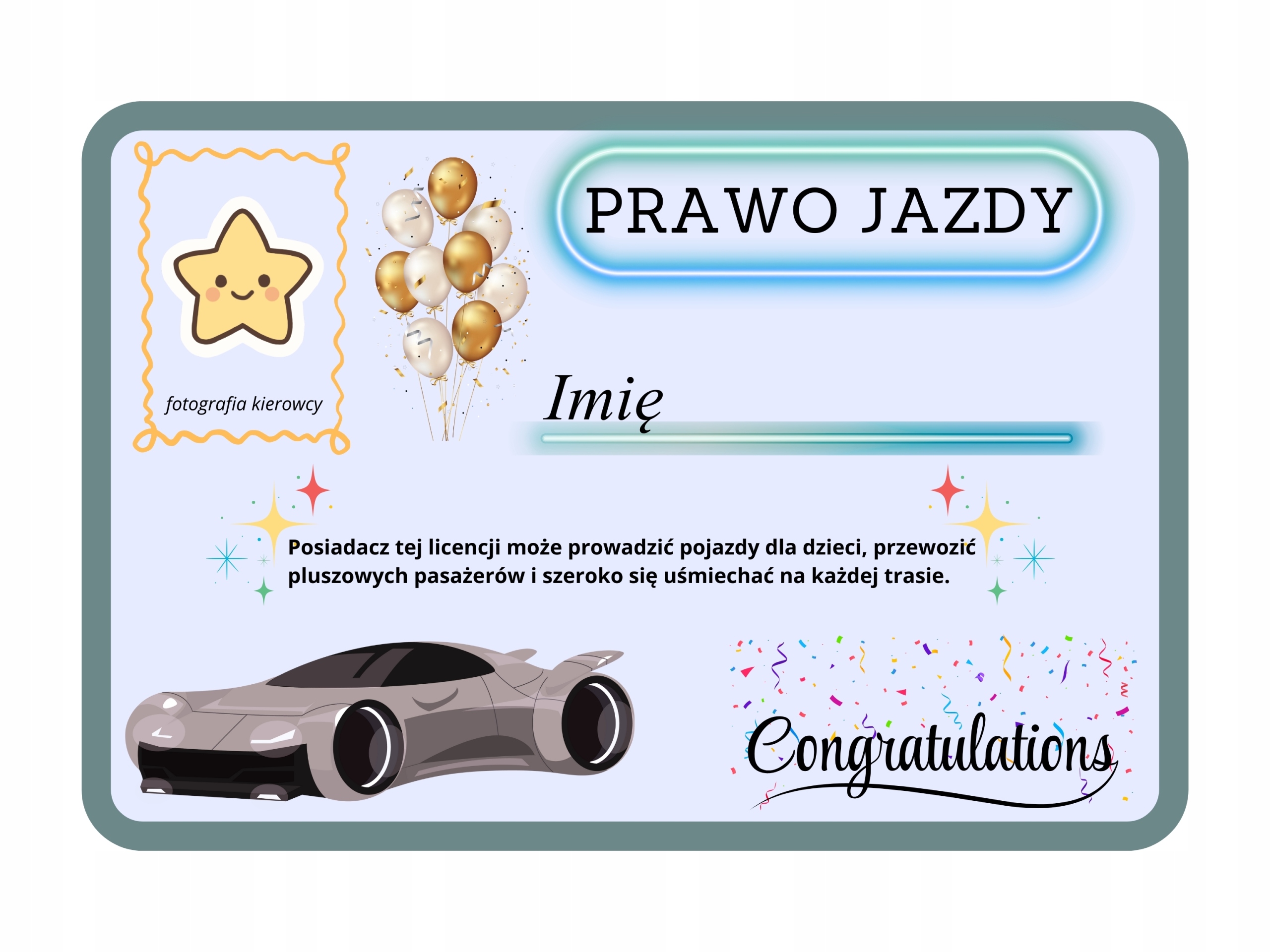 Do każdego autka dodajemy wyjątkowe, kolorowe prawo jazdy z imieniem dziecka (wpisywanym przez nas!) – prezent, który od razu wywołuje zachwyt i szeroki uśmiech.