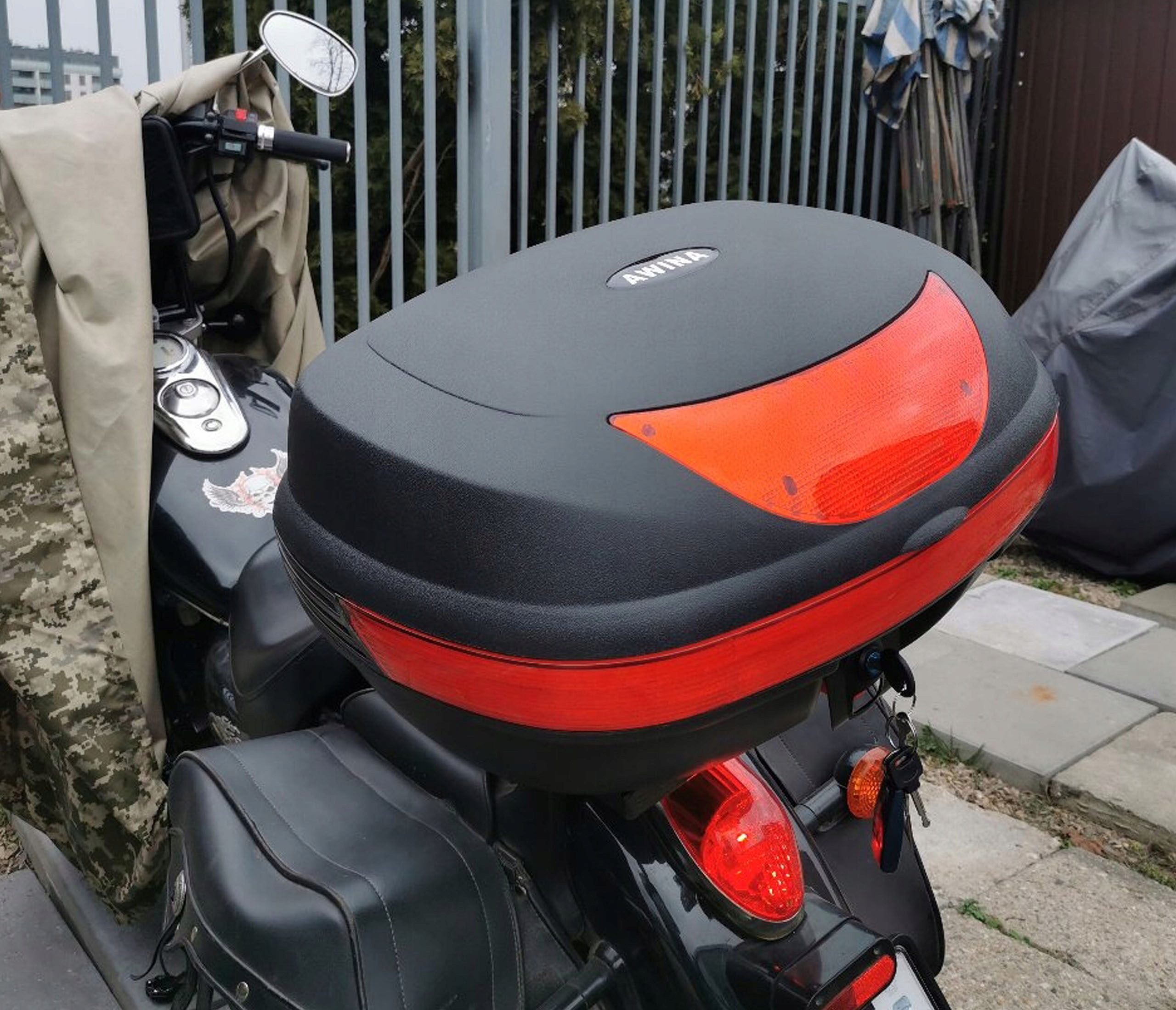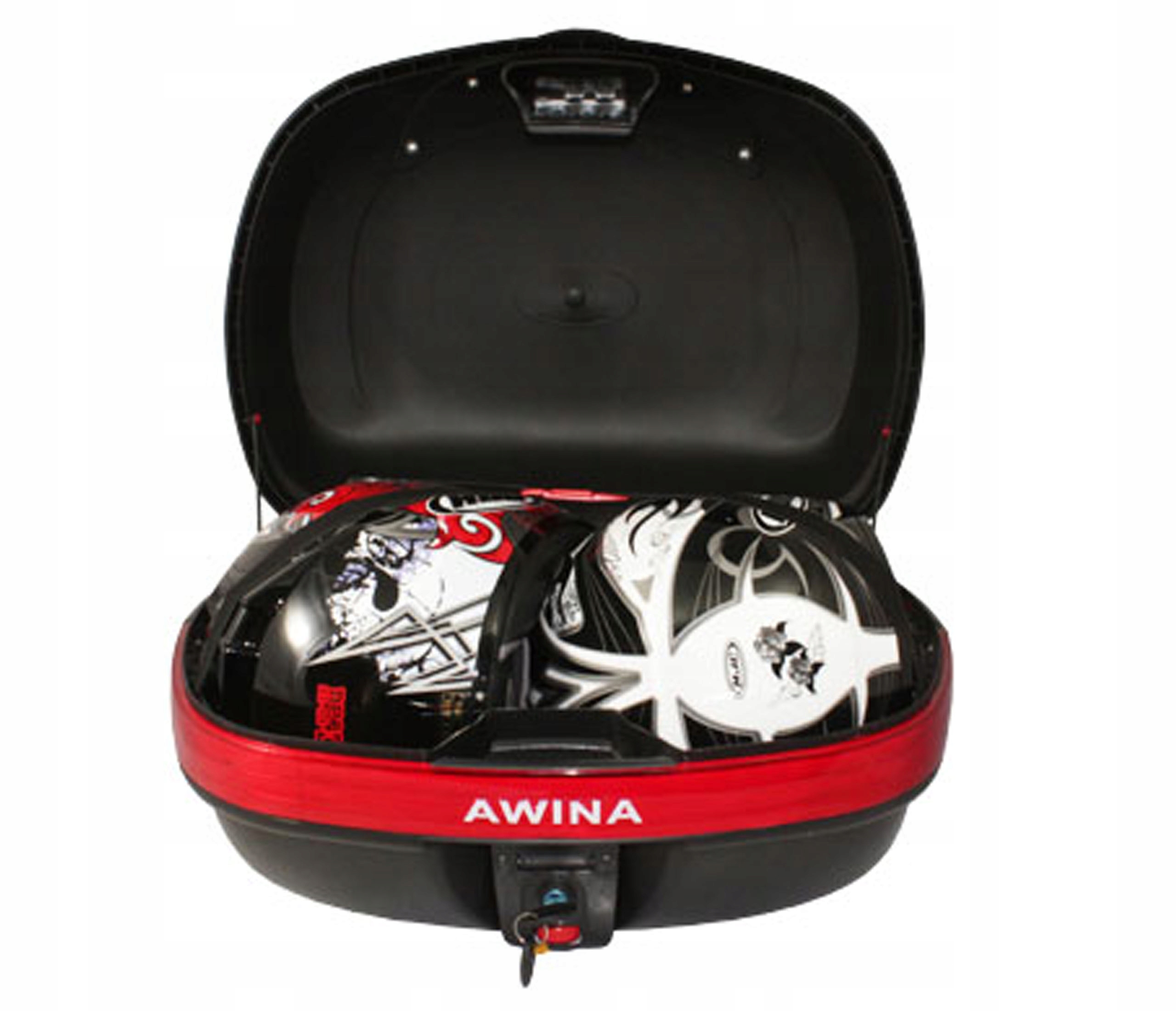 OPIS: REWELACYJNY, DUŻY I POJEMNY KUFER MOTOCYKLOWY MARKI AWINA - NA 2 KASKI. WYKONANY Z MOCNEGO I TRWAŁEGO MATERIAŁU - TWORZYWA ABS, POSIADA ZAMEK NA 2 KLUCZYKI ORAZ STELAŻE UMOŻLIWIAJĄCE ZAMOCOWANIE KUFRA NA BAGAŻNIKU. KUFER POSIADA ODBLASKI ZAPEWNIAJĄCE LEPSZĄ WIDOCZNOŚĆ NA DRODZE. KUFER JEST WYPINANY, MOŻNA GO NOSIĆ JAKO WALIZKĘ. IDEALNY DO PRZECHOWYWANIA KASKÓW LUB INNYCH PRZEDMIOTÓW NIEZBĘDNYCH KAŻDEMU MOTOCYKLIŚCIE.
