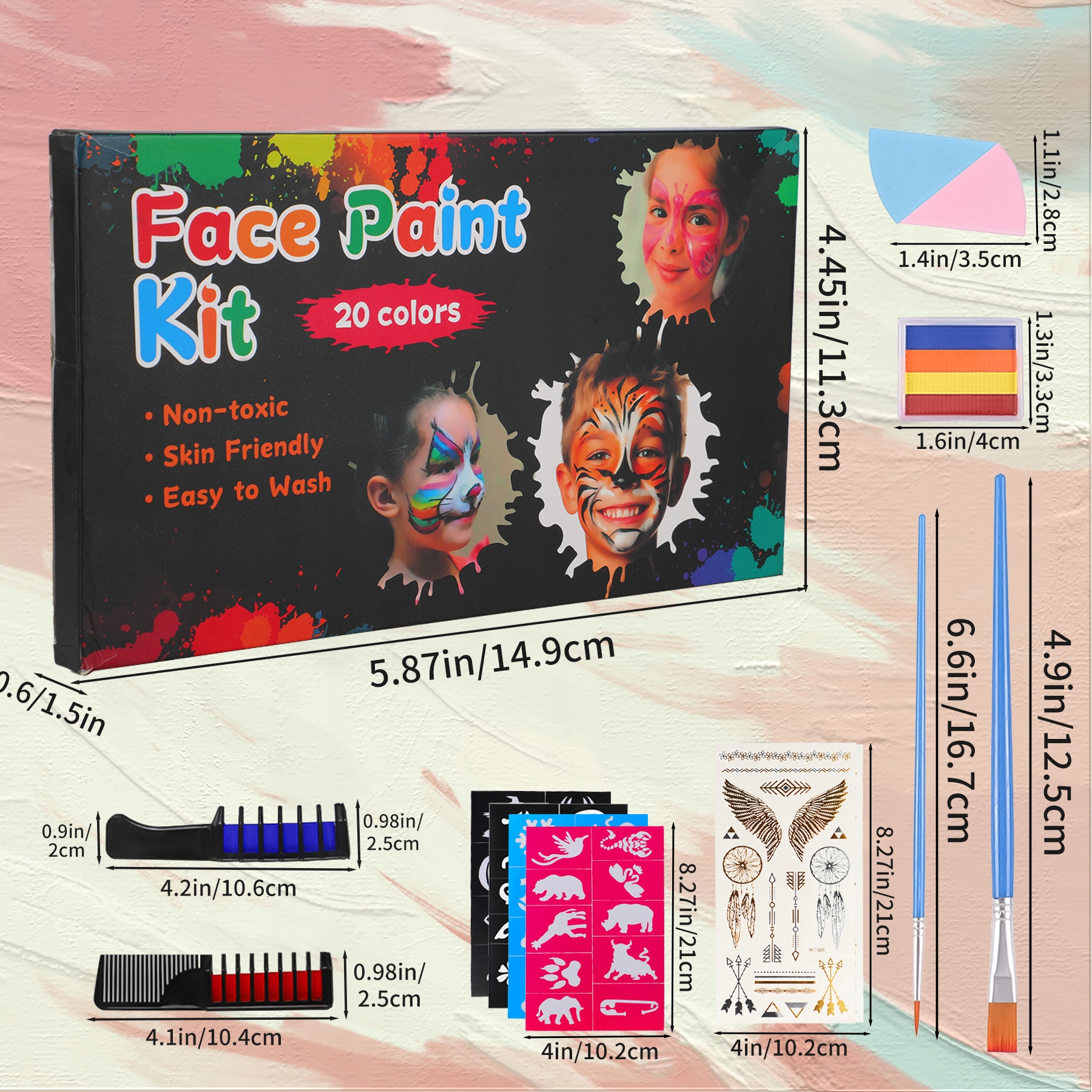 Zostaliśmy dokładnie przetestowani, ten makijaż twarzy dla dzieci to wysokiej jakości profesjonalne kosmetyki, bezpieczne, nietoksyczne, hipoalergiczne, przyjazne dla skóry, nie powodują swędzenia ani podrażnień skóry, nie musisz się martwić o bezpieczeństwo skóry swojego dziecka. Ponieważ jednak skóra każdego jest inna, zaleca się najpierw przetestowanie koloru na małym obszarze. zestaw do makijażu dla dzieci.