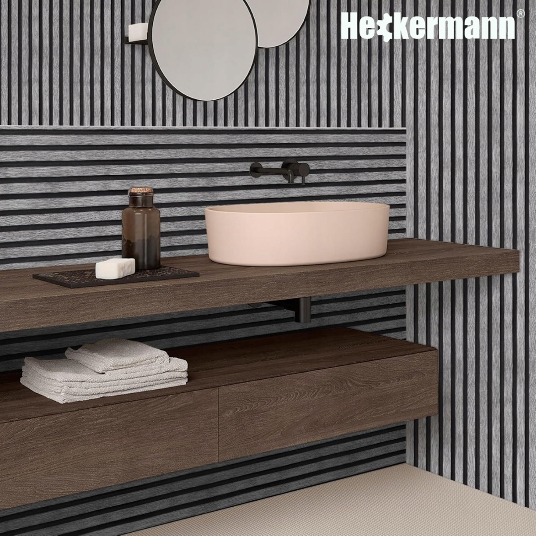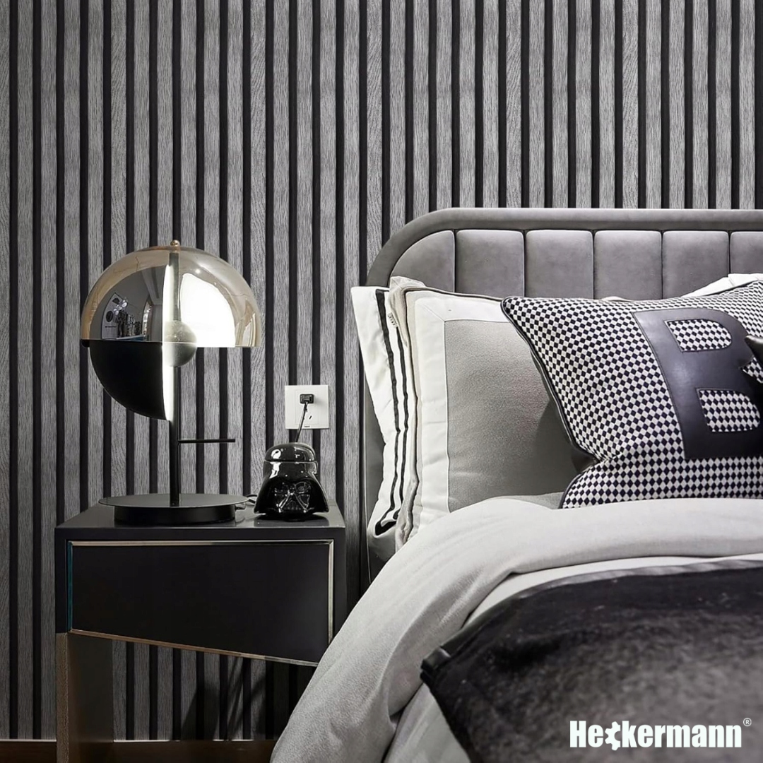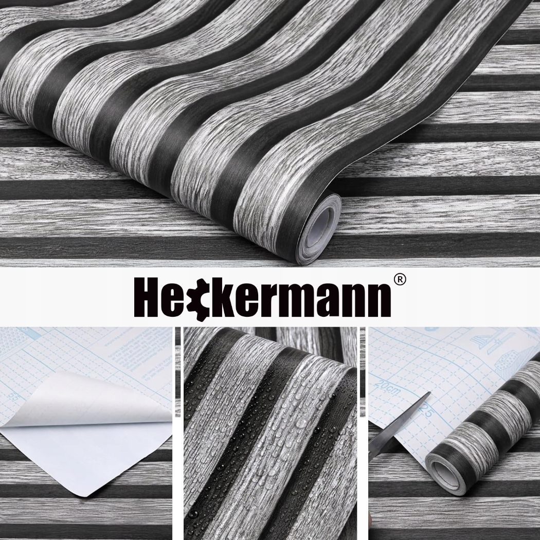 Wzór prezentowany przez Heckermann to prawdziwy majstersztyk w świecie dekoracji. Połączenie szarego odcienia drewna z czarnymi pasami tworzy efekt nowoczesnego, eleganckiego wykończenia przypominającego modne panele lamelowe.