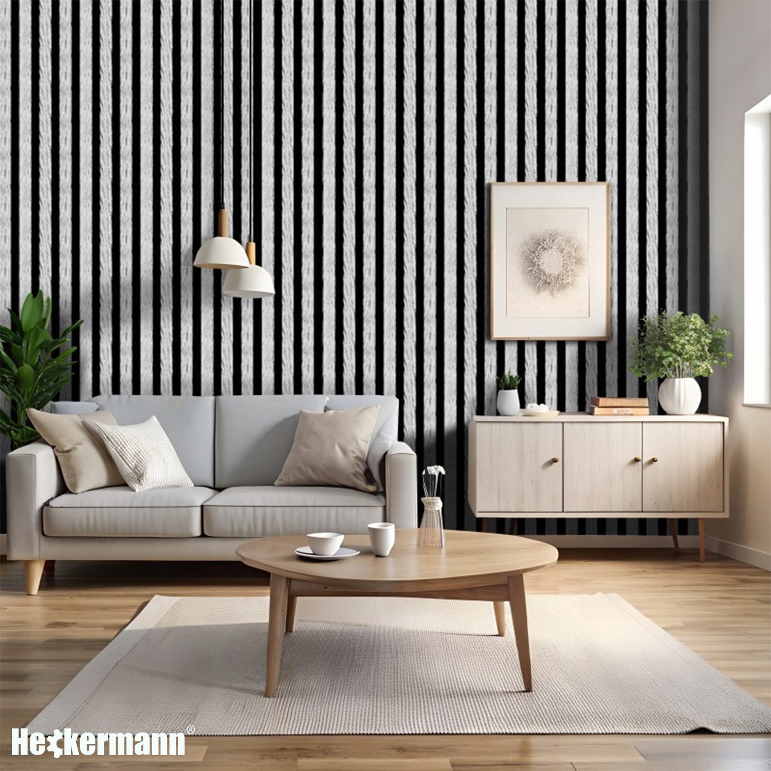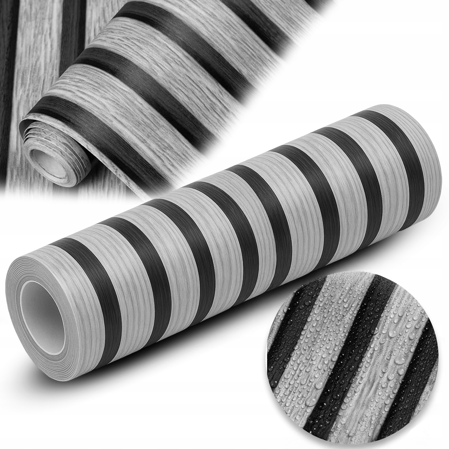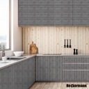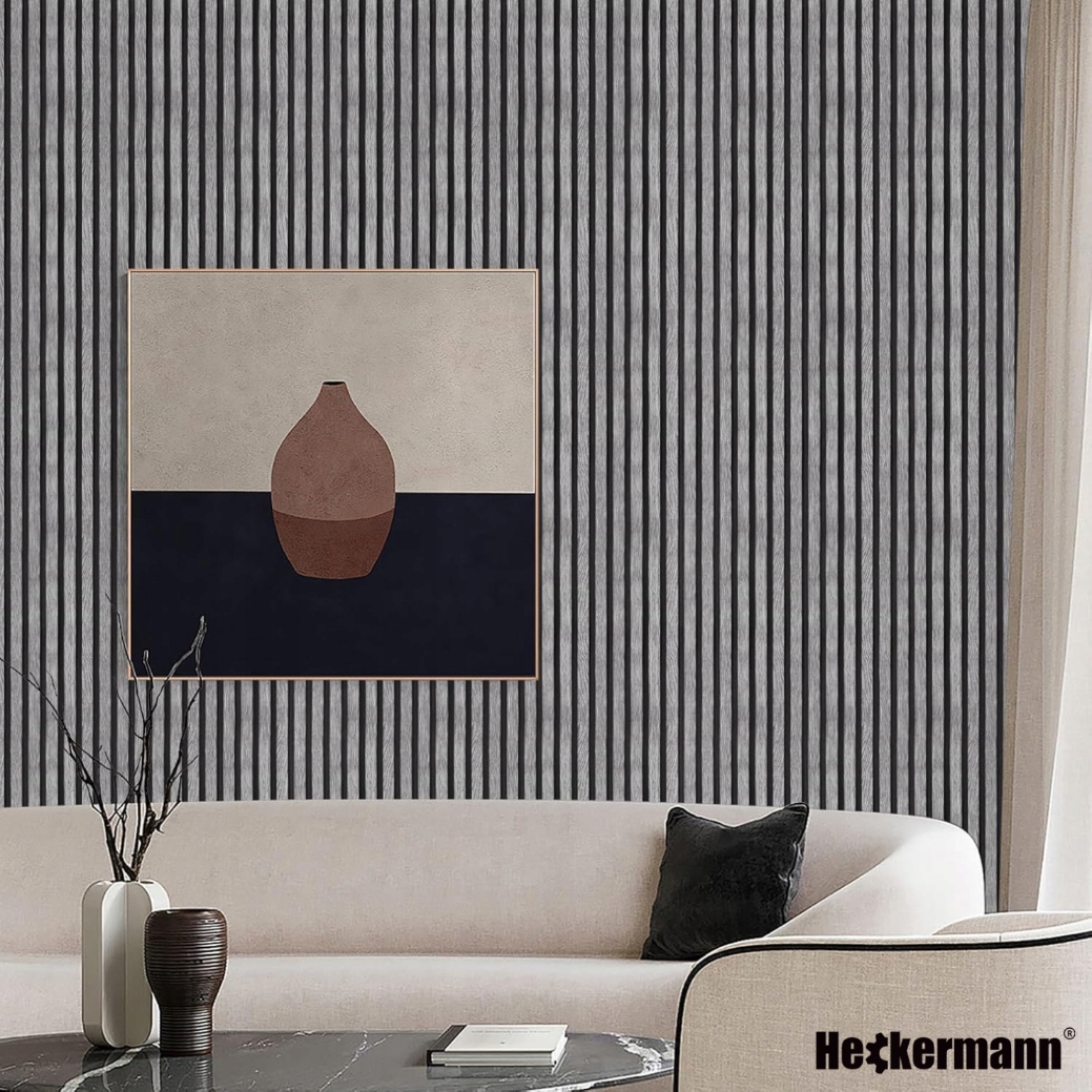 Wzór prezentowany przez Heckermann to prawdziwy majstersztyk w świecie dekoracji. Połączenie szarego odcienia drewna z czarnymi pasami tworzy efekt nowoczesnego, eleganckiego wykończenia przypominającego modne panele lamelowe.