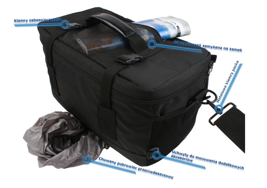 Dla zapewnienia maksimum wygody torba została również wyposażona w uchwyt do noszenia pokryty specjalną warstwą materiału antypoślizgowego. Pod spodem torby znajdują się specjalne uchwyty umożliwiające podpięcie statywu przy pomocy dołączonych do zestawu pasków mocujących.