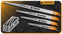 Każdy element wyposażony jest w uniwersalny uchwyt, który zapewnia kompatybilność z większością dostępnych na rynku pił szablastych i gwarantuje szybki montaż.