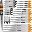 Zestaw obejmuje aż 28 brzeszczotów o długościach od 4” do 12” i uzębieniu w zakresie 6–24 TPI, co umożliwia optymalne dopasowanie do rodzaju materiału i charakteru pracy.