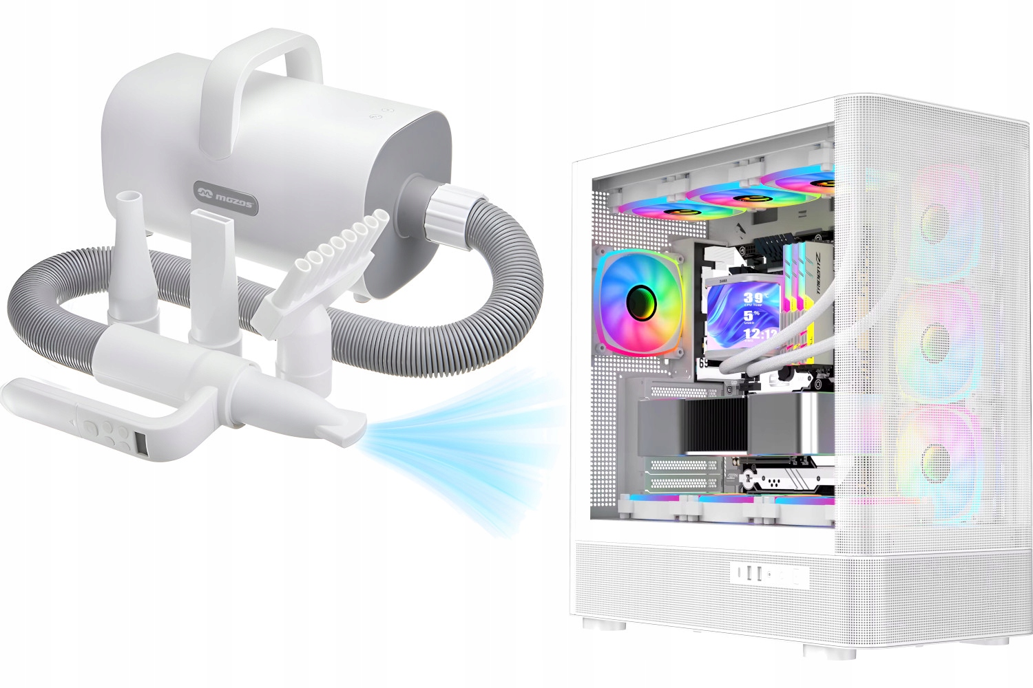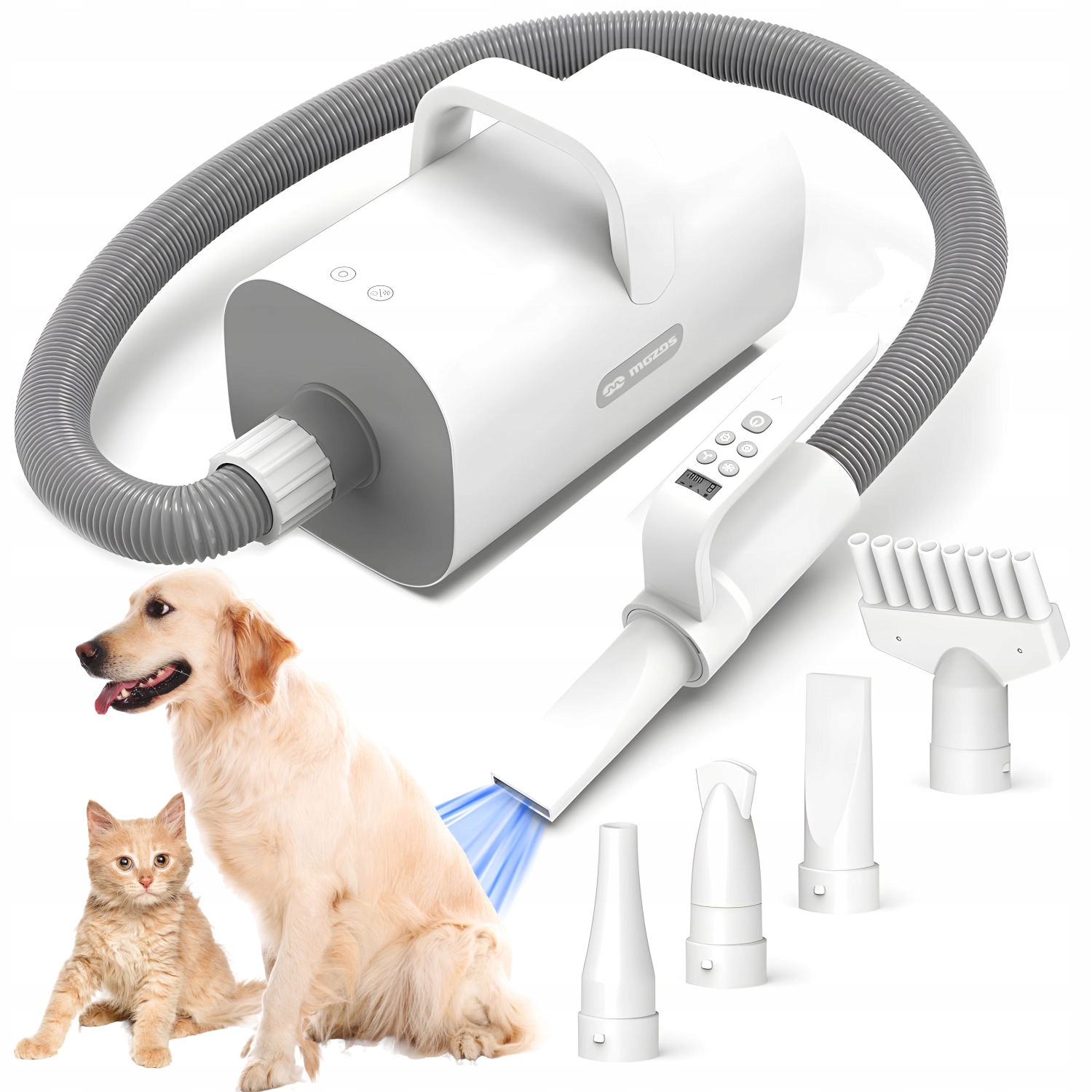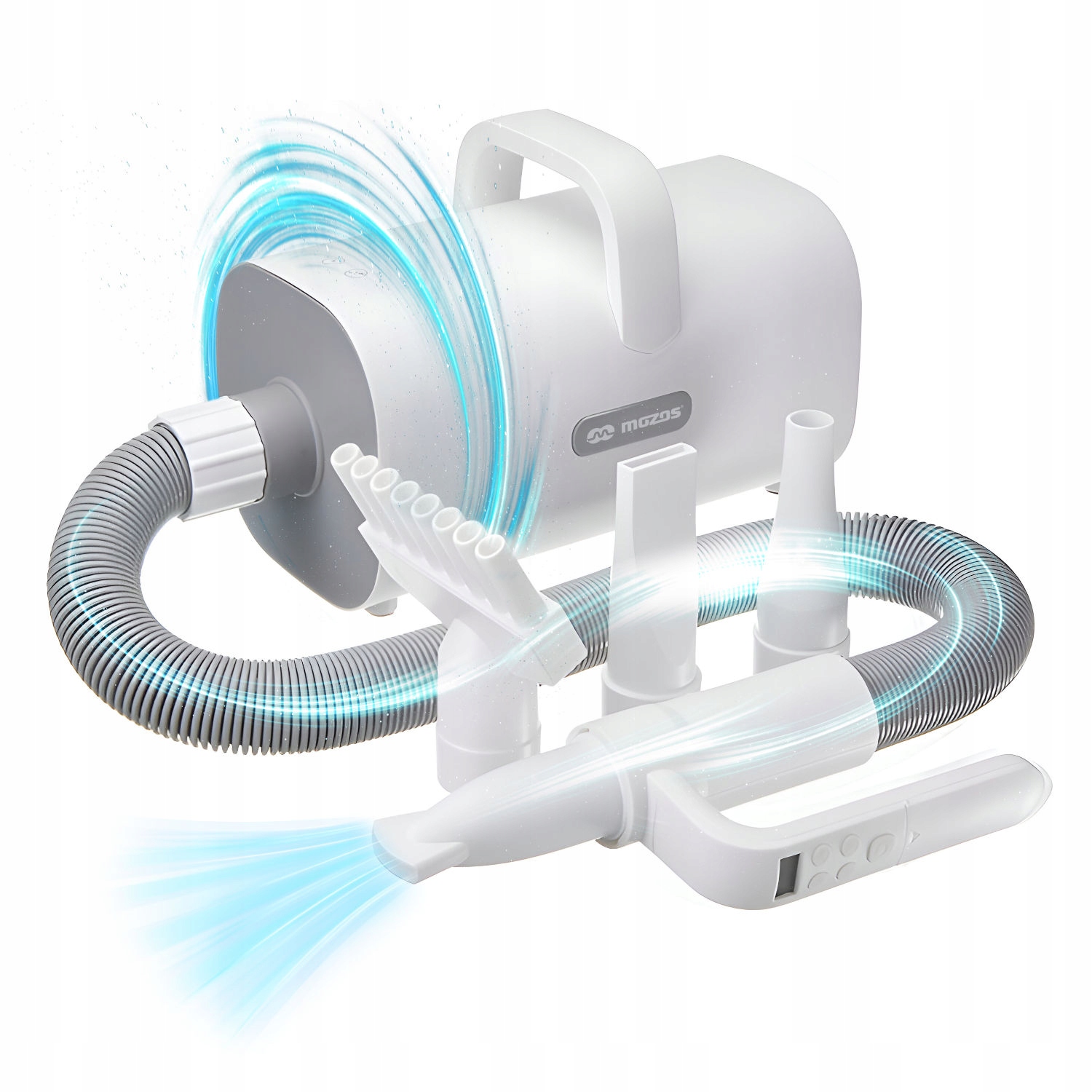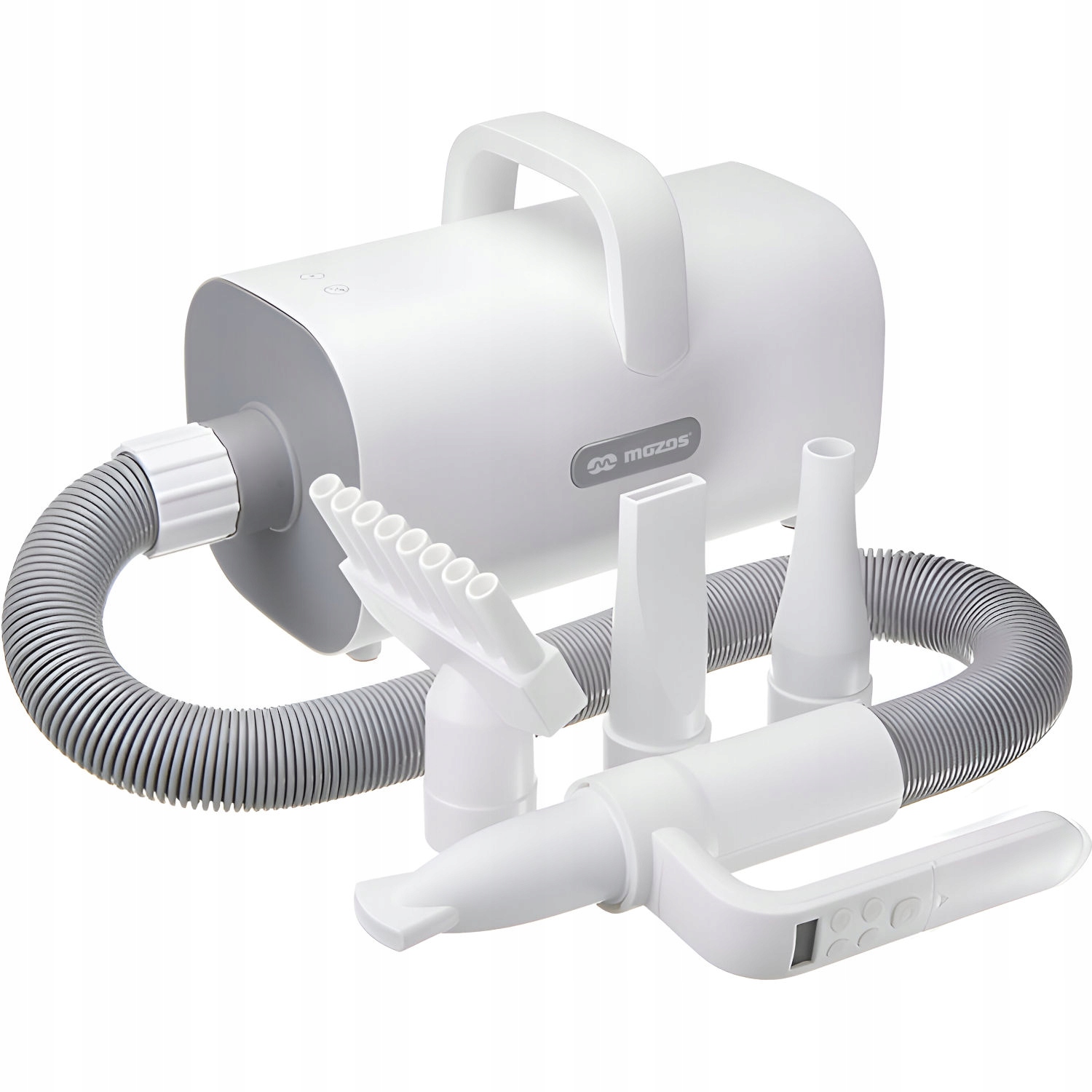 Z poziomem hałasu w zakresie 60-85 dB, XB1-PRO oferuje cichą pracę, co jest istotne podczas suszenia zwierząt, które mogą być podatne na stres. To jeden z kluczowych parametrów wyboru urządzenia do zastosowań groomerskich. Wbudowany pilot w uchwycie pozwala na zdalną regulację temperatury, co zapewnia wygodę i oszczędność czasu. Z funkcją zdalnego sterowania możesz szybko dostosować ustawienia, nawet jeśli trzymasz urządzenie w ręku lub znajdujesz się w pewnej odległości od dmuchawy. Mozos XB1-PRO waży jedynie 3,8 kg, co sprawia, że jest łatwa do przenoszenia i manewrowania. Kompaktowa konstrukcja (330 x 215 x 155 mm) pozwala na wygodne przechowywanie, a materiał ABS użyty do produkcji obudowy zapewnia wytrzymałość i odporność na uszkodzenia. Elastyczny wąż o długości 700 mm umożliwia wygodny dostęp do trudno dostępnych miejsc, co jest szczególnie przydatne podczas czyszczenia sprzętu elektronicznego. W zestawie znajduje się dmuchawa Mozos XB1-PRO. Inne elementy mają ukazać jedynie przykładowe zastosowanie.