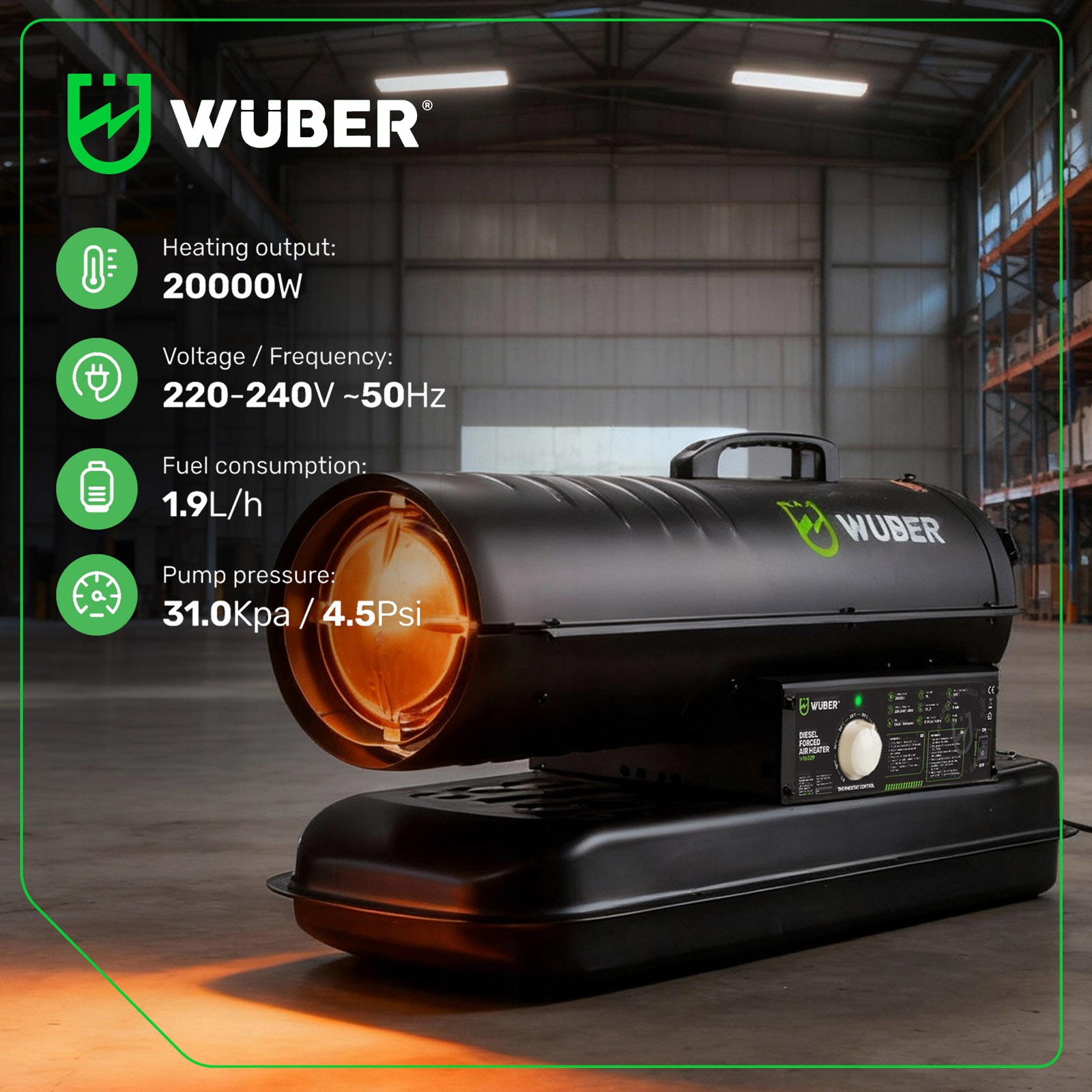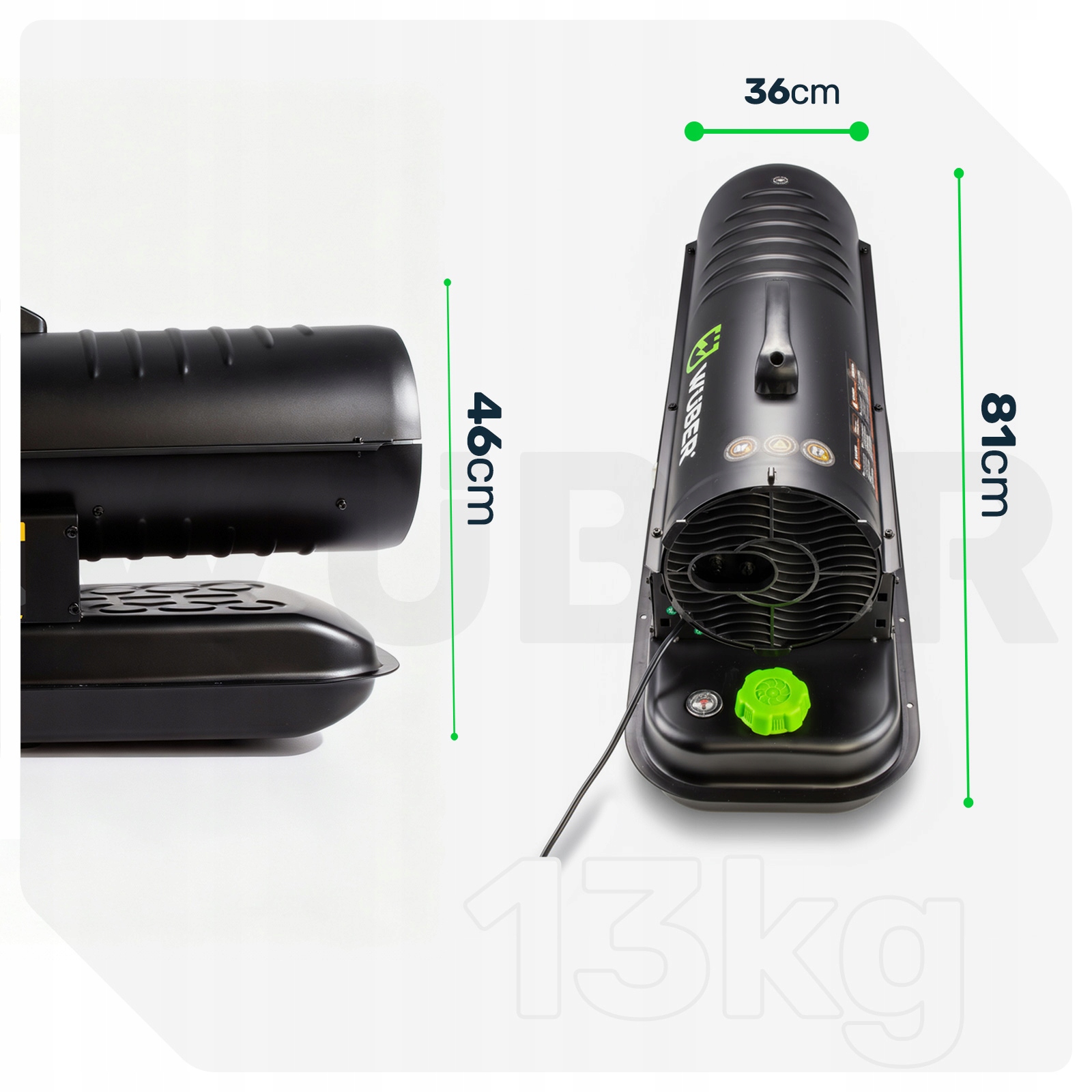 Nagrzewnica olejowa marki Wuber jest przeznaczona do efektywnego ogrzewania dużych powierzchni, takich jak magazyny, hale i warsztaty.