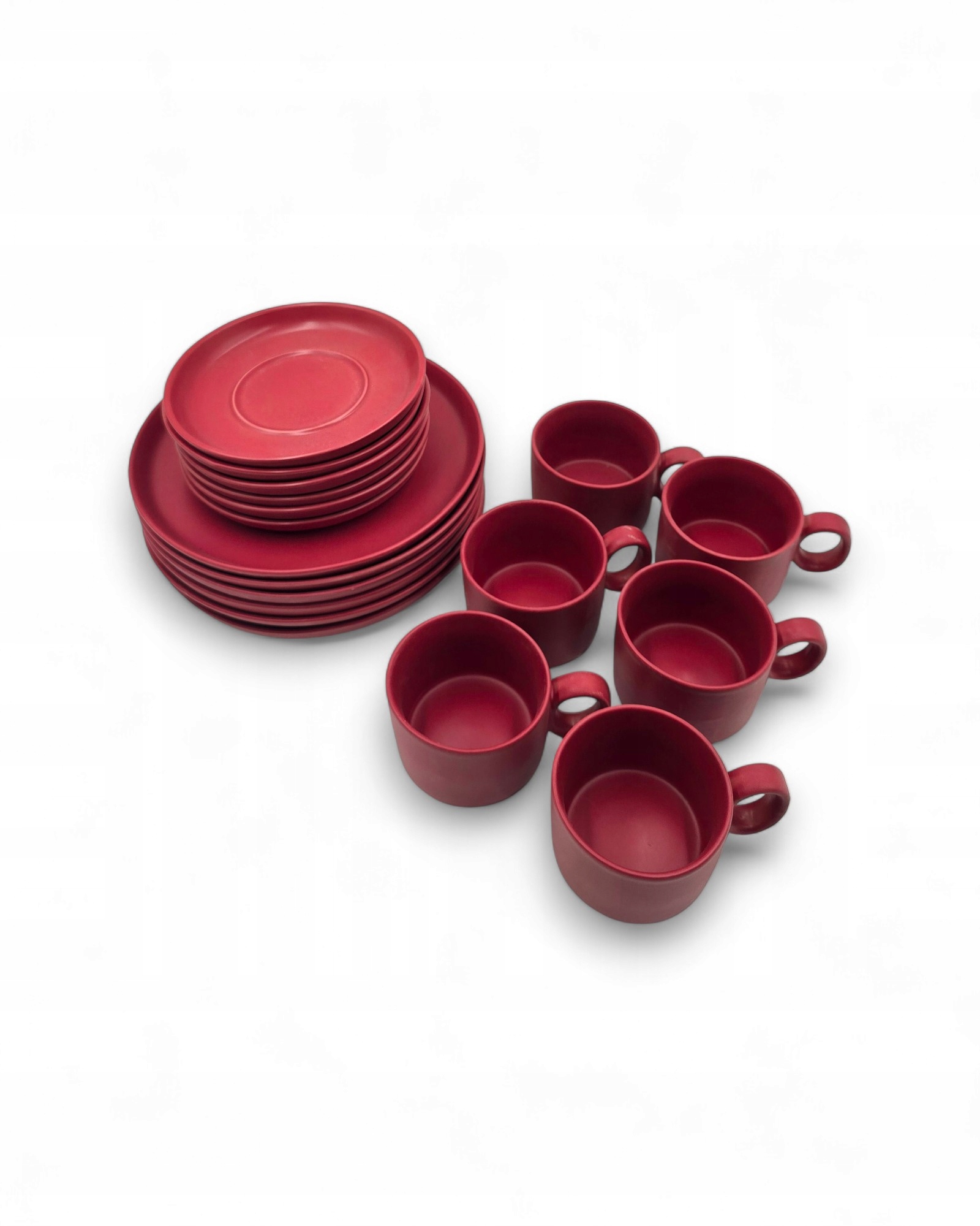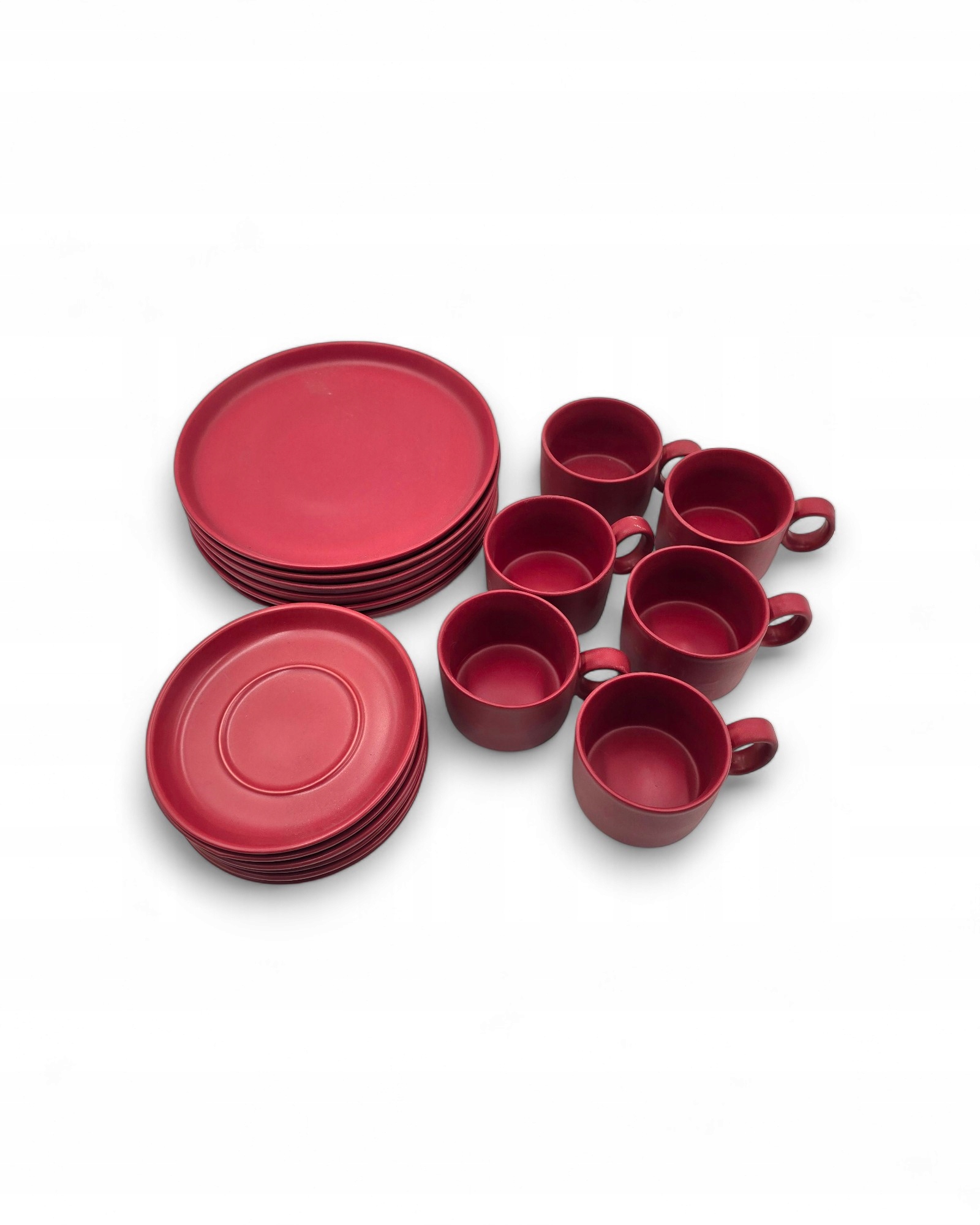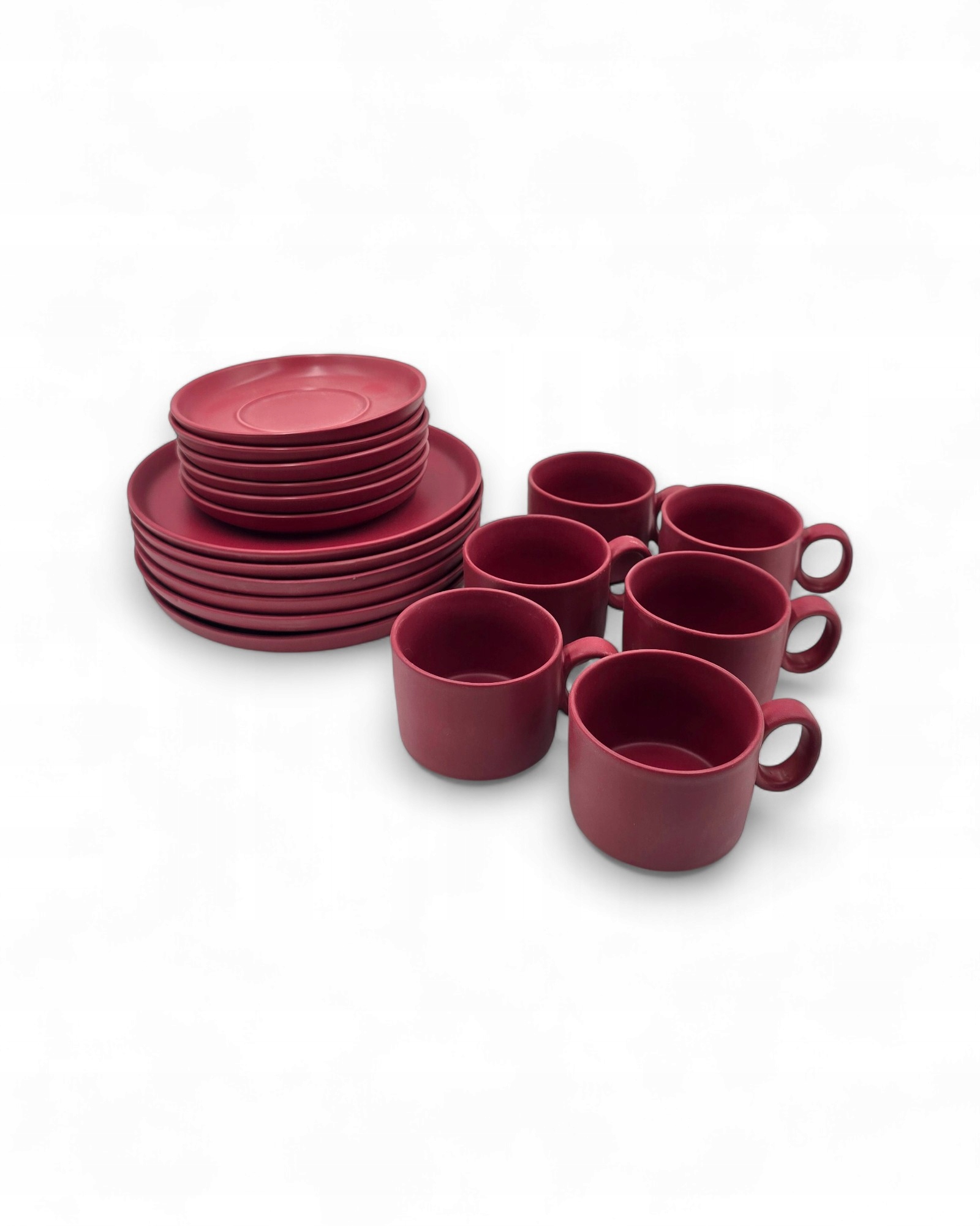 Oferuję zestaw naczyń wykonanych z ceramiki kamionkowej w ciepłym odcieniu bordowym. To klasyka stylu retro / PRL / vintage, idealna dla osób ceniących klimat dawnych domowych zastaw.