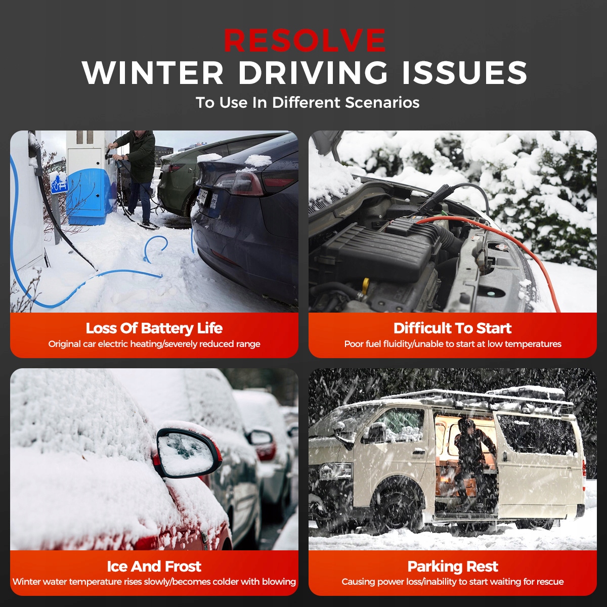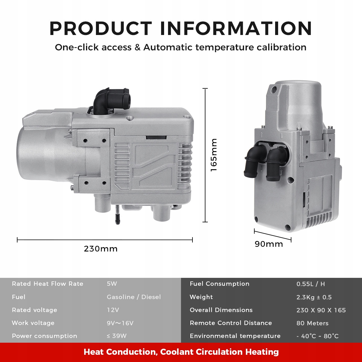 - Multi funkcjonalny: może zapewnić źródło ciepła dla samochodu, zwiększyć temperaturę wewnątrz samochodu, wstępnie podgrzać płyn chłodzący silnik i zapobiec zużyciu silnika w niskich temperaturach. Może być stosowany do rozmrażania wnętrza pojazdów, uruchamiania pojazdów i rozmrażania akcesoriów do szyb samochodowych.