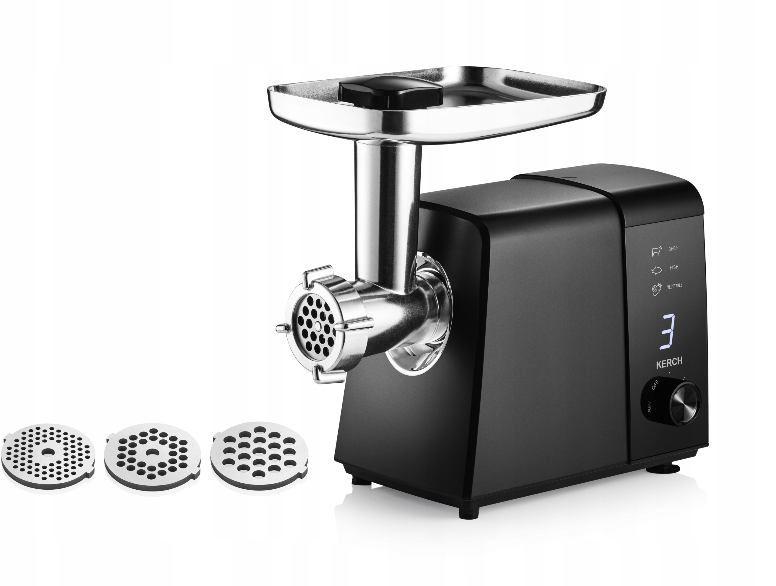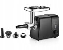 Moc szczytowa 2500W | 3 tryby pracy i bieg wsteczny | Akcesoria do mielenia | Akcesoria masarskie | Szatkownica z 4 bębnami | 3 sita do mielenia 3 mm, 5 mm, 7 mm | Tacka metalowa | Antypoślizgowe nóżki | Wyświetlacz LED | Przewód zasilający