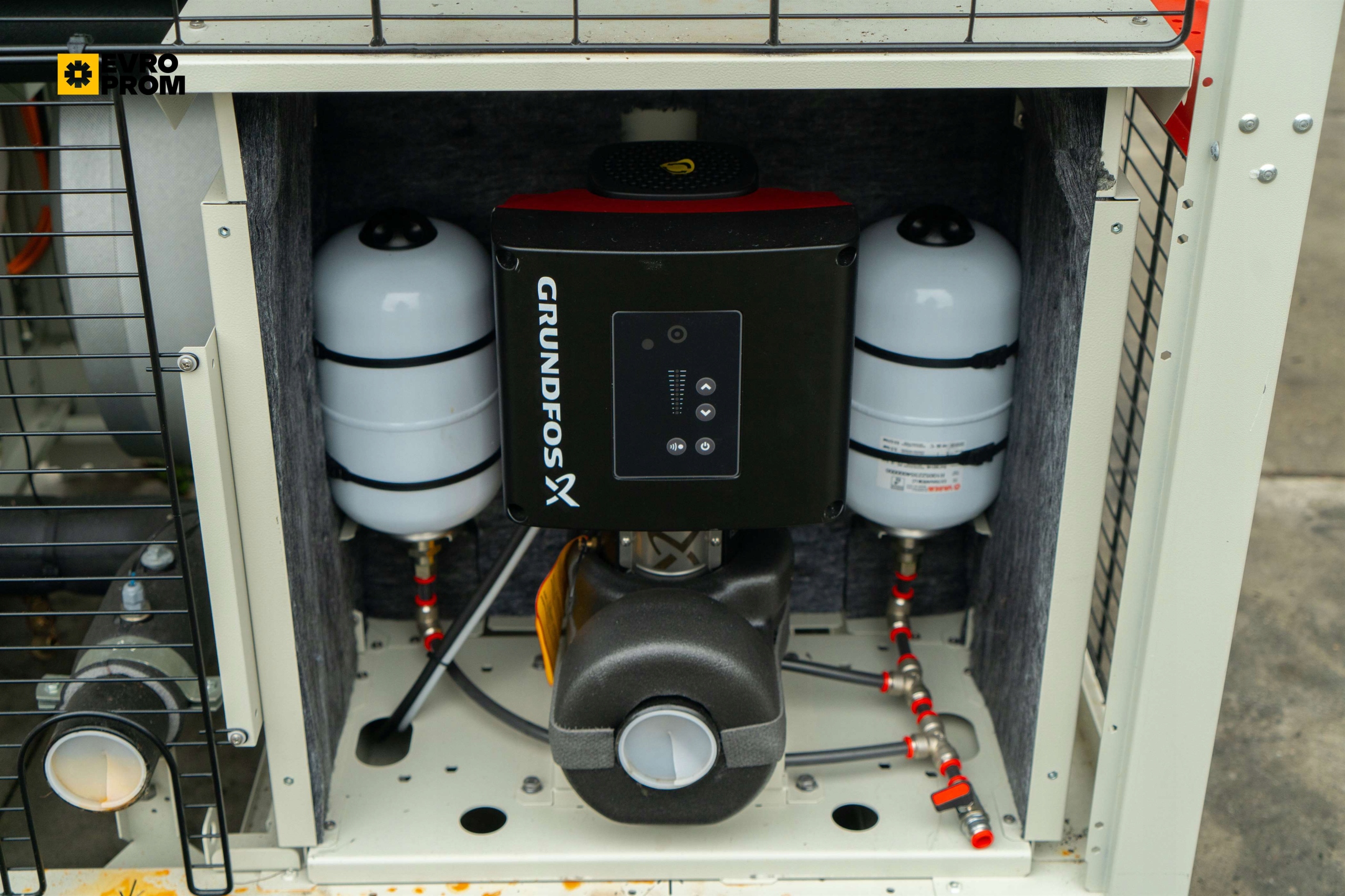 Hydraulic module: 1 pcs. water pump Grundfos TPE2 50-180 N-X-F-A-BQQE-GYC (inverter), 2 pcs. Expansion vessel, buffer tank.