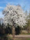 Kwiaty pojawiają się wczesną wiosną, przed liśćmi. Są białe lub różowe, bardzo liczne, co czyni drzewo bardzo dekoracyjnym w tym okresie.