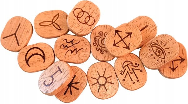 Zawiera 13 drewnianych run, 176-stronicową, kolorową książeczkę po angielsku, hiszpańsku, włosku i portugalsku