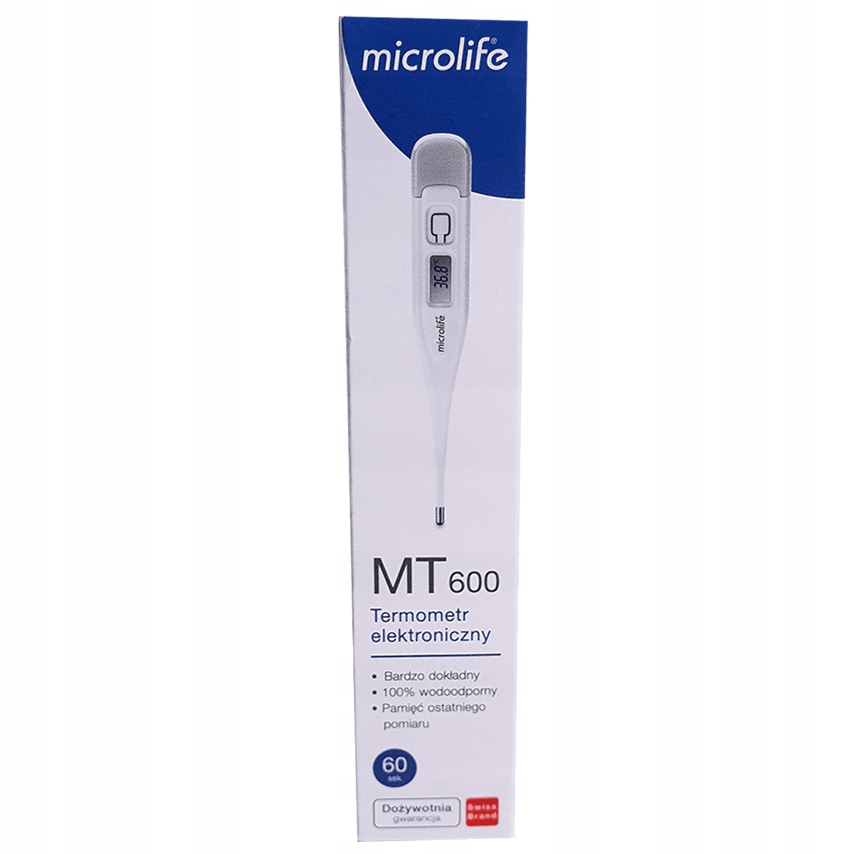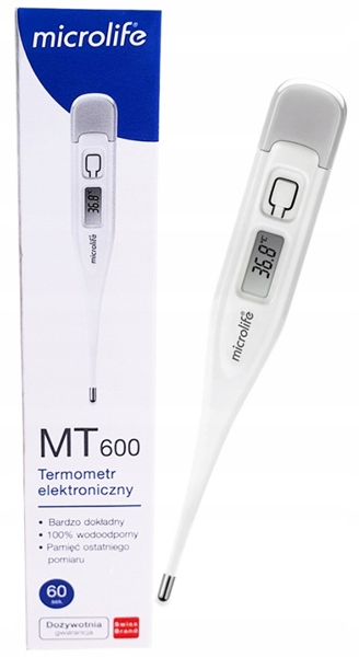 TERMOMETR ELEKTRONICZNY MICROLIFE MT 600 jest urządzeniem służącym do pomiaru temperatury ciała. Urządzenie jest wodoszczelne. Czas pomiaru to 60 sekund.