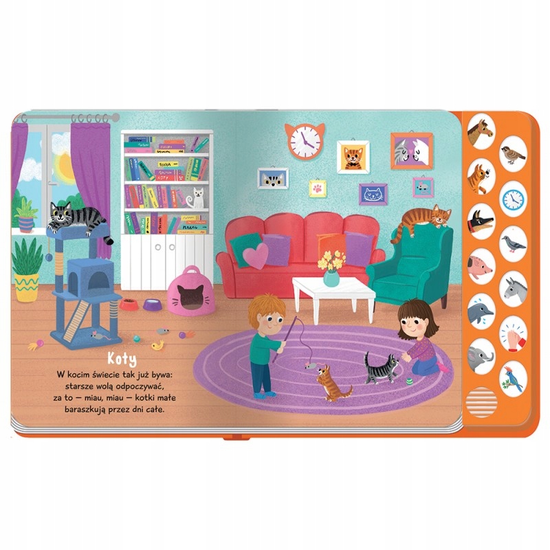 Książka dla małych miłośników zwierząt, a w niej bogate ilustracje oraz wierszowane historyjki o ulubionych zwierzakach. Dodatkową atrakcją są dołączone dźwięki. Posłuchaj, jak brzmią: koń, kot, pies, świnka, delfin, słoń, papuga, osioł oraz inne zwierzęta i przedmioty pokazane w książce. Do czytania, słuchania i oglądania!