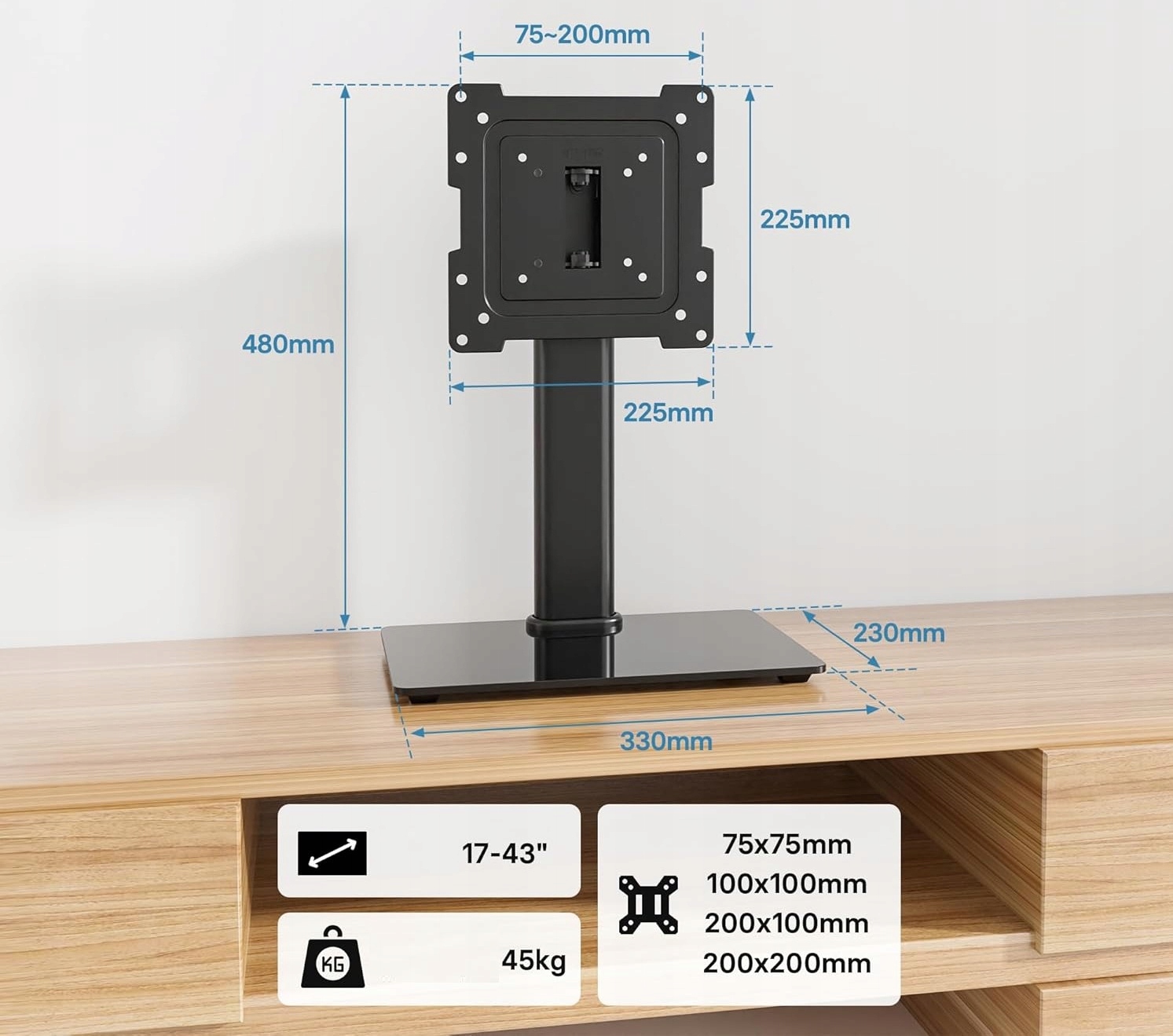 Sprawdź rozmiar swojego telewizora i upewnij się, że mieści się w zakresie od 17 do 43 cali, a także upewnij się, że waga telewizora jest mniejsza niż 45 kg/99 lbs. Jeśli tak, ten stojak pod telewizor będzie pasował. Jeśli Twój telewizor ma mniej niż 225 mm x 225 mm, widoczny będzie talerz lub haczyk uchwytu. Jeśli Twój telewizor spełnia te kryteria, nasz stojak na telewizor jest dla Ciebie idealny.