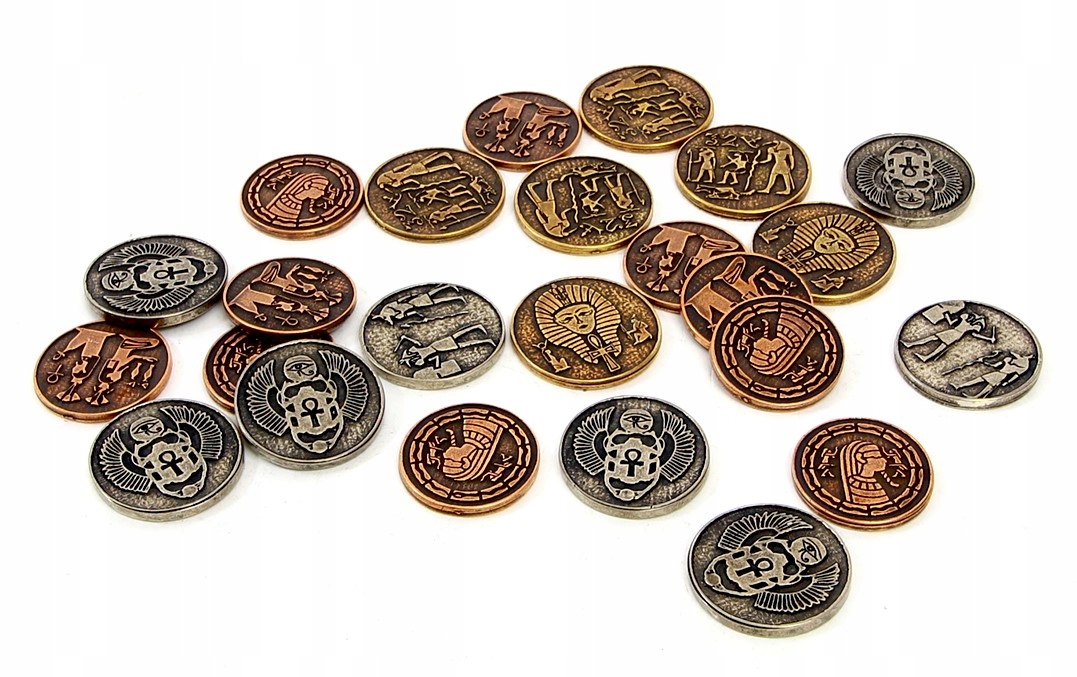 Wykonany ze stopów cynku zestaw 20 cudownych, ciężkich monet które odkopaliśmy wraz ze skrzynią pełną skarabeuszy. Ktoś chce jednego? Amon Ra spojrzał na swój udręczony lud i zesłał im plagę urodzaju. Odtąd wody wylewały na wiosnę i rosiły pola, które latem dawały plon obfity. Set, widząc, co jego brat uczynił, przebrał się za śmiertelnika i wkradł na dwór faraona. Wtedy rzekł mu „Władco, proponuję szybszy sposób wymiany dóbr, niż gliniane tabliczki ryte przez twych skrybów. To nie ma tak, że jest to dobre czy niedobre, ale jeśli zapytasz mnie, co cenię w życiu najbardziej, odpowiem, że pieniążki. Twoi poddani będą czcić cię za to. Wybij monety ze swoimi podobiznami”. Faraon tak uczynił i przyozdobił pieniądz swym profilem, zawarł również na nich portrety bogów. Ra spojrzał po wielu dniach drzemki na swój lud i ze zgrozą odkrył przebiegły plan Seta. Odtąd Egipcjanie tworzyli chciwie majątek na fałszywych obietnicach narodowej waluty, uciskali chłopów i wprowadzili niewolnictwo, by gromadzić stosy monet w swoich skarbcach. Poważany nie był wytwórca, ale zdolny pośrednik, cwaniaczek bez skrupułów i moralności, pijawka społeczna na zdrowej tkance Egiptu. Amon Ra zezłościł się mocno na swój lud i zesłał im największą plagę znaną tamtemu światu – Izraelitów z magicznymi zdolnościami rozstąpienia Morza Czerwonego.