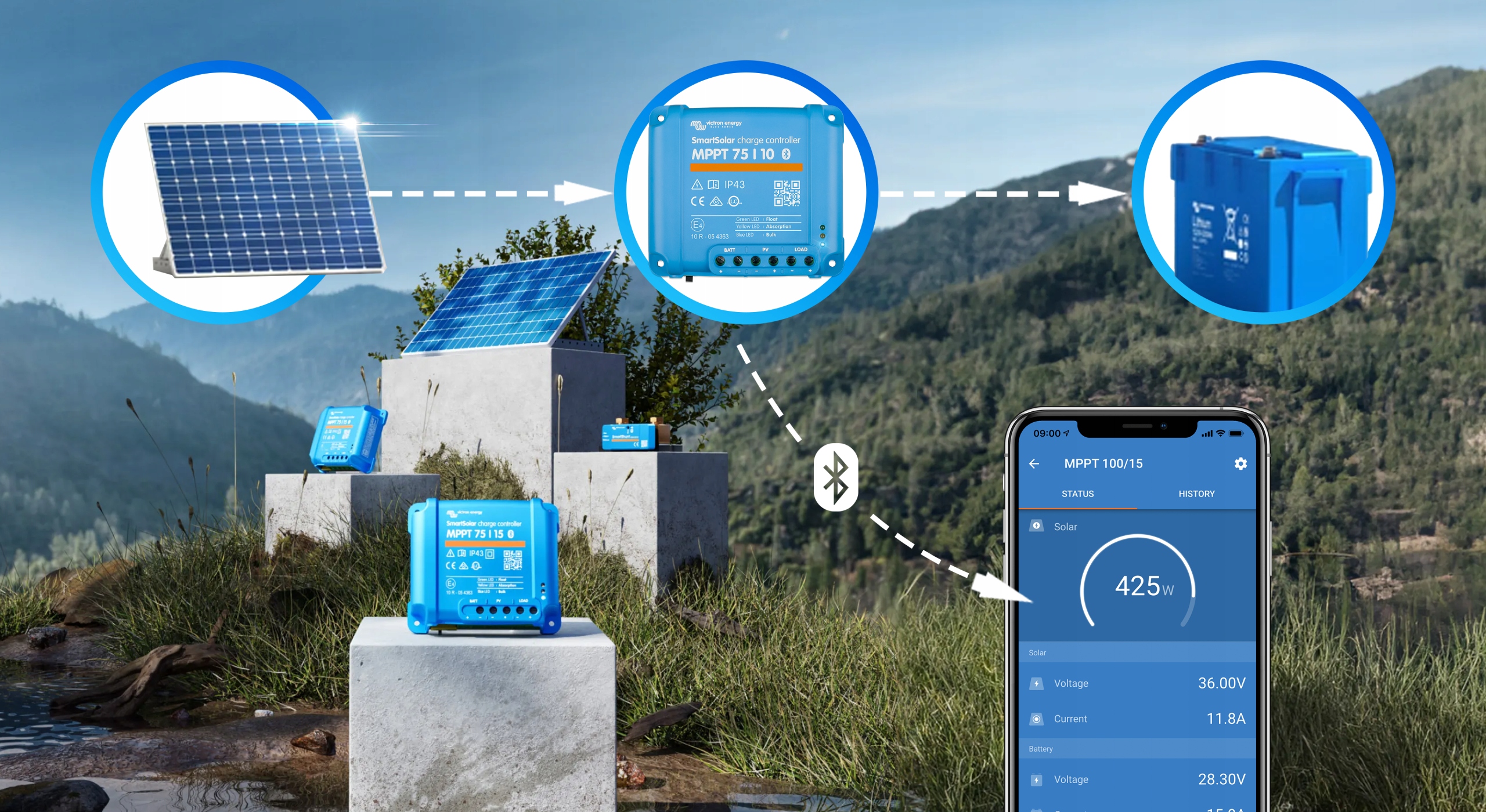 SmartSolar to urządzenie służące do ładowania akumulatora z paneli solarnych. Nadwyżka energii wytworzonej z paneli solarnych w ciągu dnia jest dzięki niemu gromadzona w akumulatorze aby skorzystać z niej kiedy produkcja z fotowoltaiki jest już niewystarczająca lub nie ma jej wcale. Solarny regulator ładowania możesz także wykorzystać w obecnym systemie zasilania swojego pojazdu lub łodzi odciążając alternator a także w innych systemach np. wykorzystujących agregat prądotwórczy lub sieć operatora aby wydłużyć czas pracy „na baterii”.