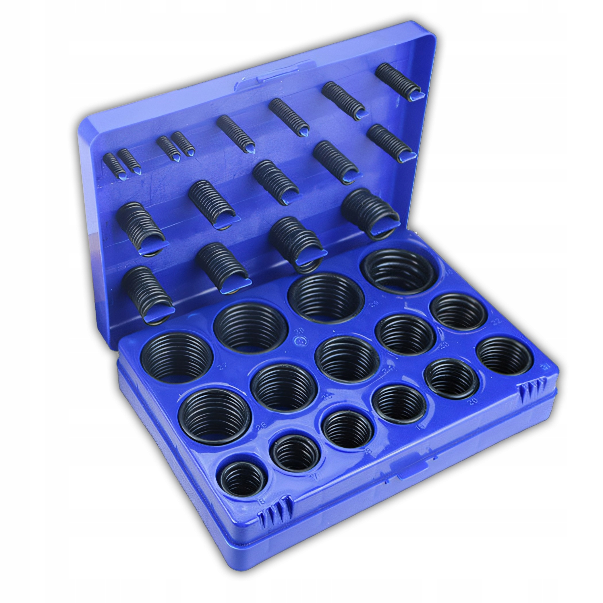 Dzięki temu pudełko umożliwia łatwy dostęp do poszczególnych oringów, a ich różne rozmiary są dobrze uporządkowane, co ułatwia szybkie znalezienie odpowiedniego elementu.