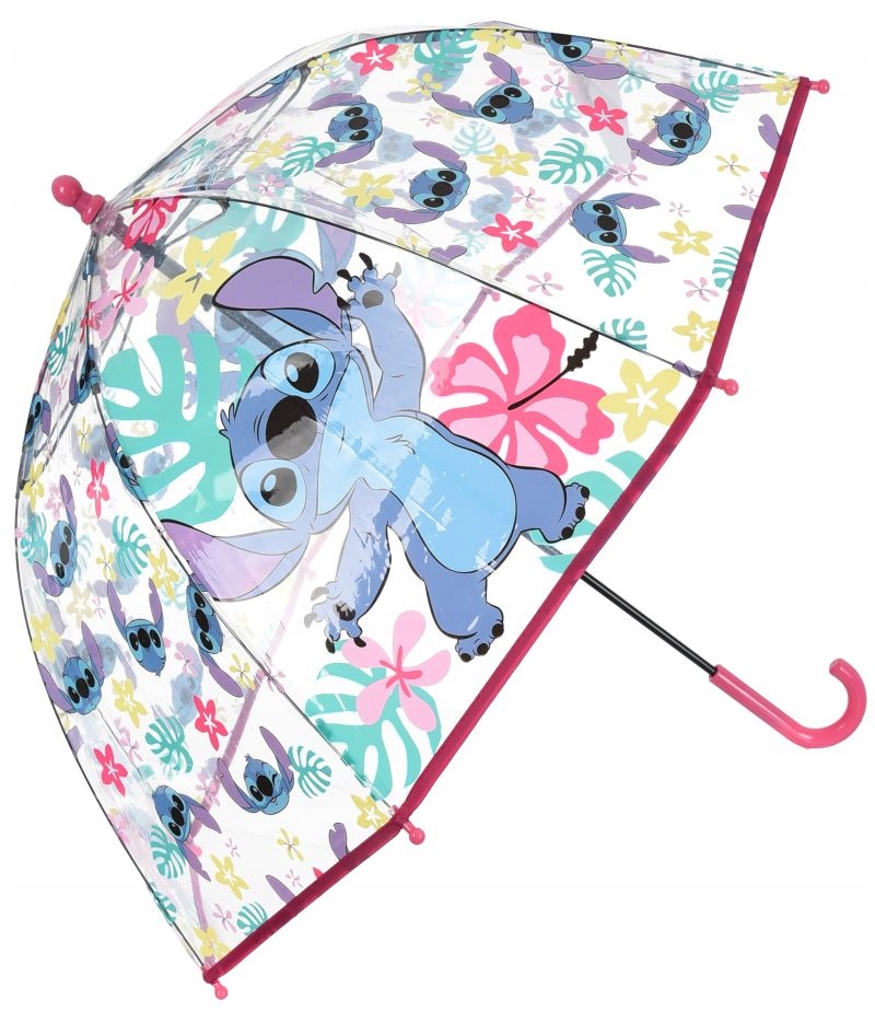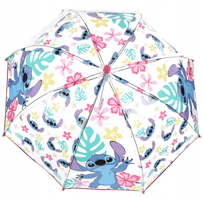 Cały parasol jest różowy z kolorowymi wstawkami przedstawiającymi Stitcha oraz inne postacie, tworząc radosny, wielobarwny design.