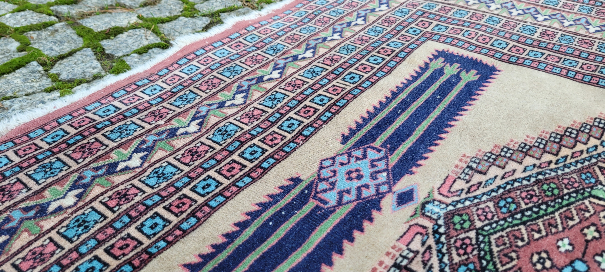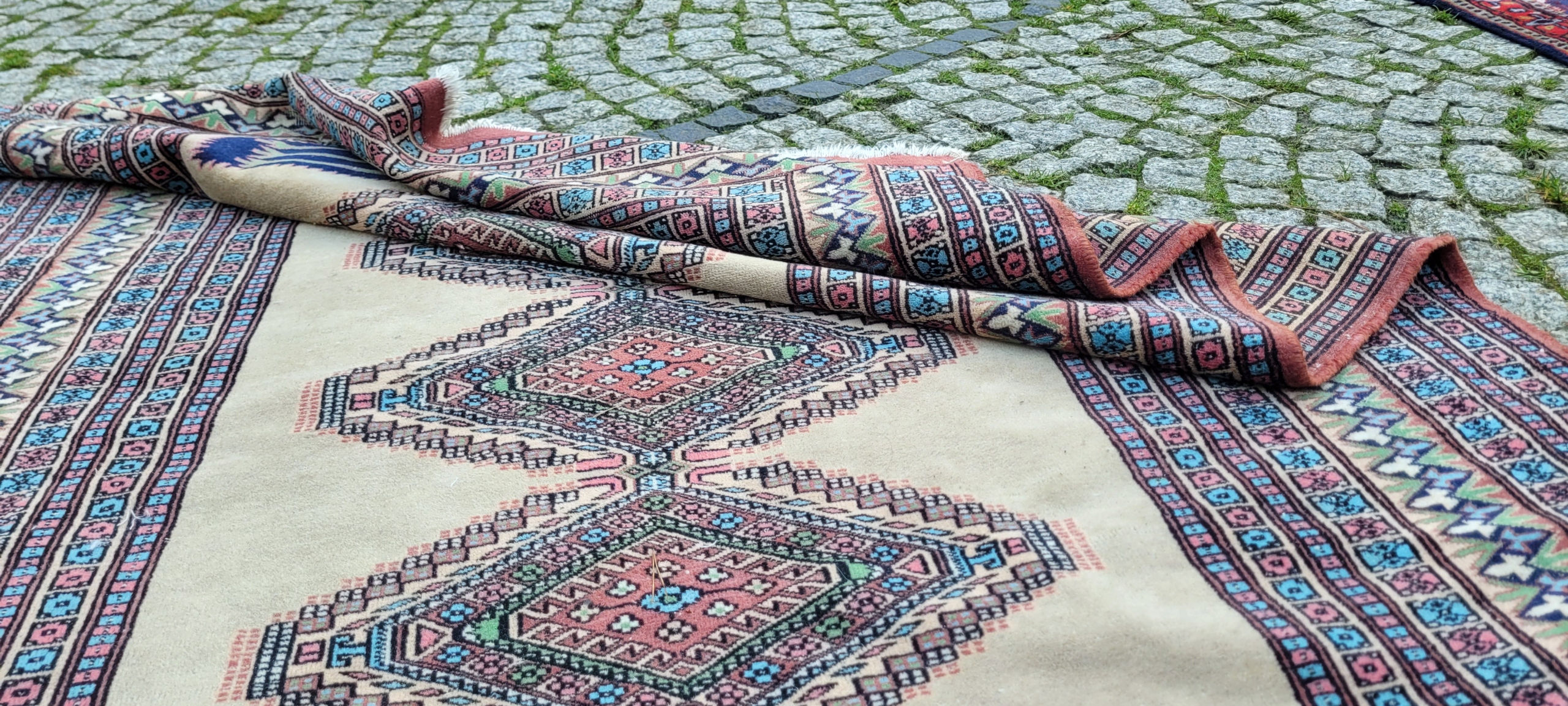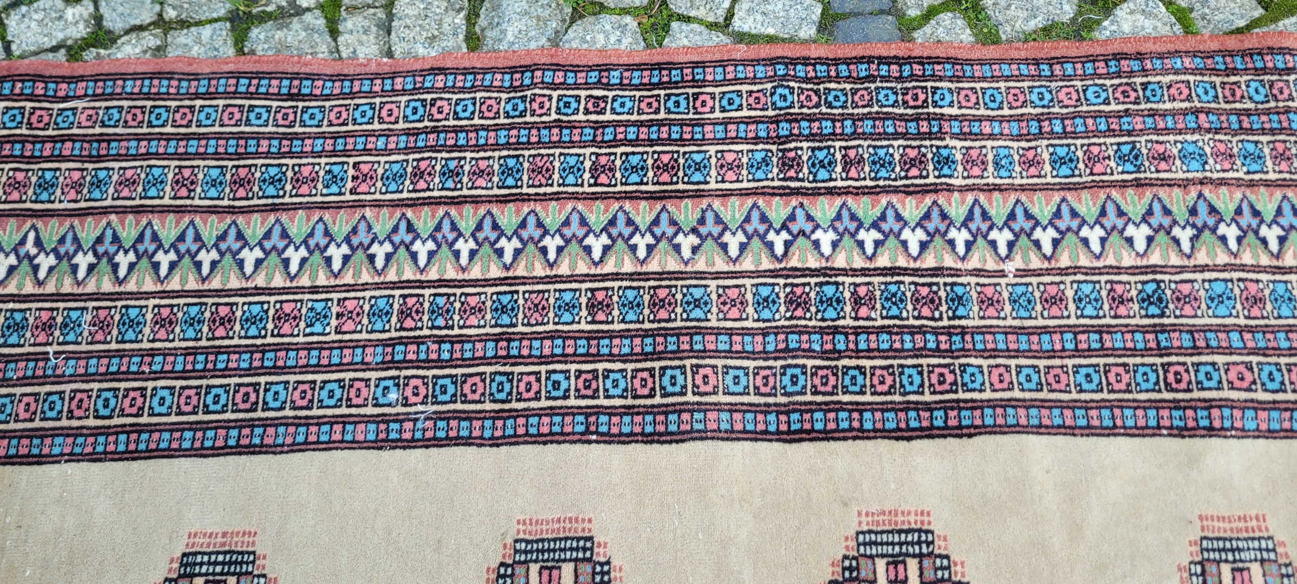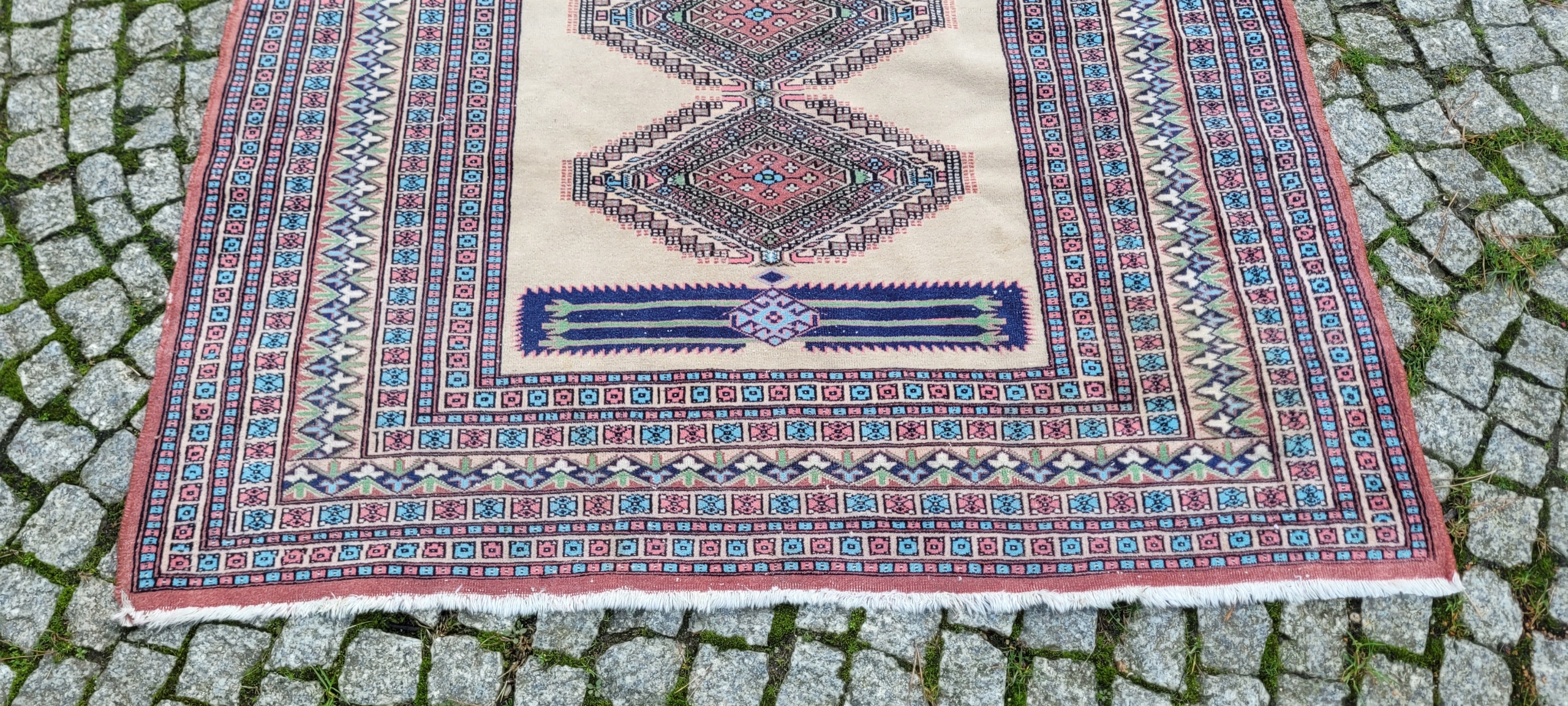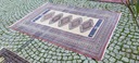 Dywan Buchara. Tkany ręcznie z wysokiej jakości wełny. Charakteryzuje się zwartym, przyjemnym w dotyku, lśniącym runem oraz piękną kolorystyką i wzornictwem. Jest zachowany w stanie dobrym widocznym na zdjęciach.