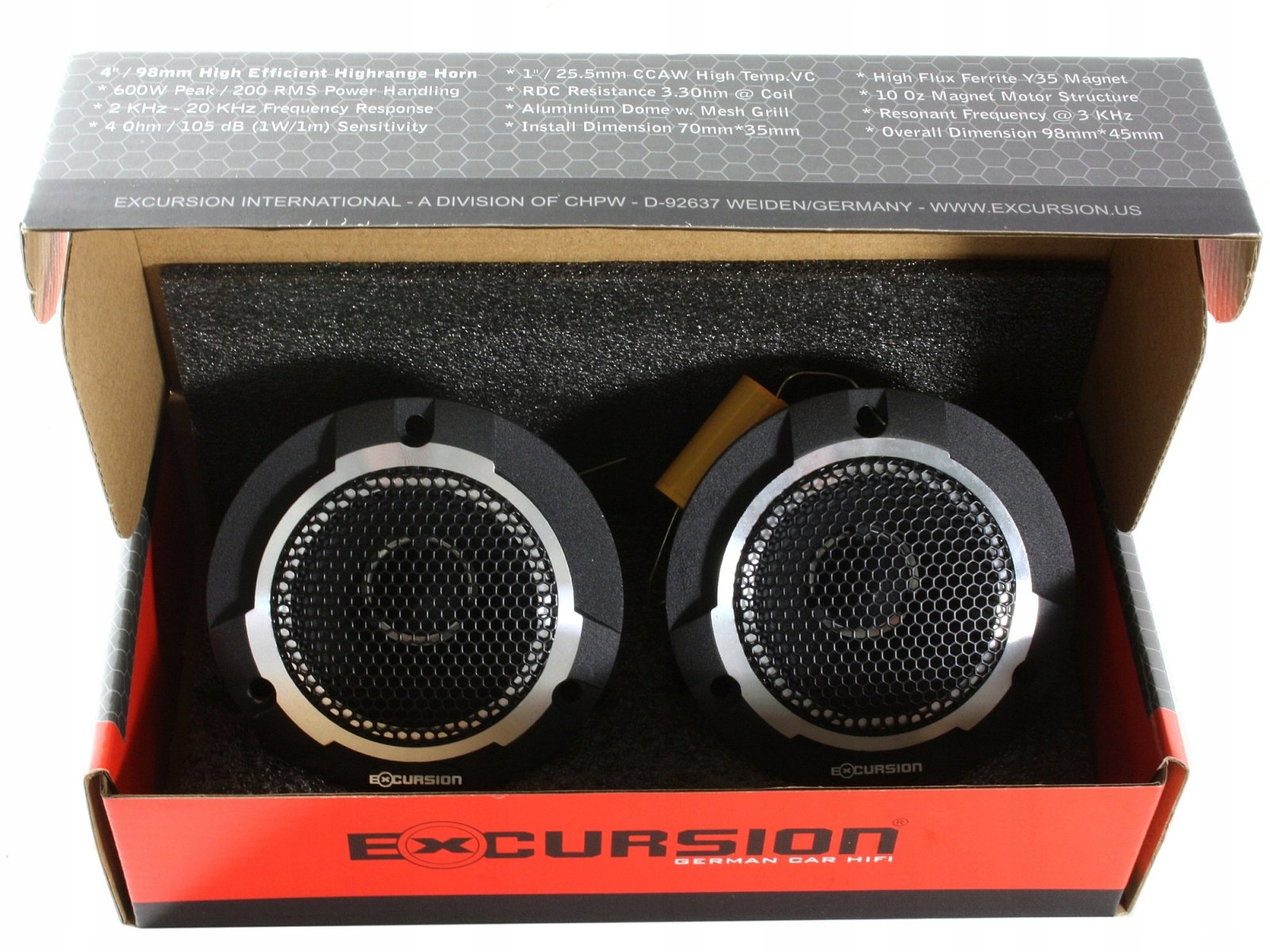 Samochodowe tweetery Excursion XXX-T1 o średnicy 70/98 mm to produkty niemieckiej marki Excursion, należące do serii XXXTreme. Dzięki wyjątkowo wysokiej efektywności należą do grupy najgłośniej brzmiących głośników samochodowych dostępnych na rynku.