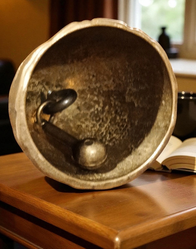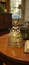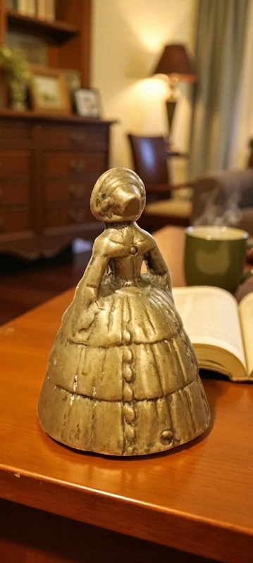 Ręczny dzwonek jak za dawnych lat który to oznajmiał początek i koniec przerwy. Nieodzowny atrybut poczciwego woźnego. Ten rozmiarami jest mniejszy i formą inny. Przedstawia szlachciankę a w części sukni jest kielich dzwonka. Wykonany z mosiądzu - stan bardzo dobry.