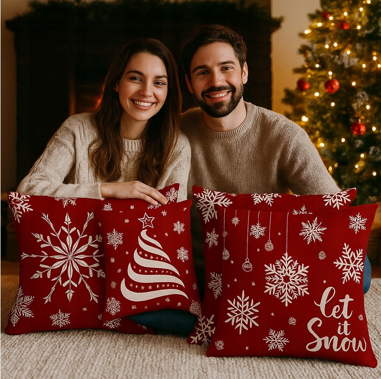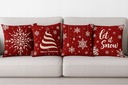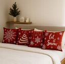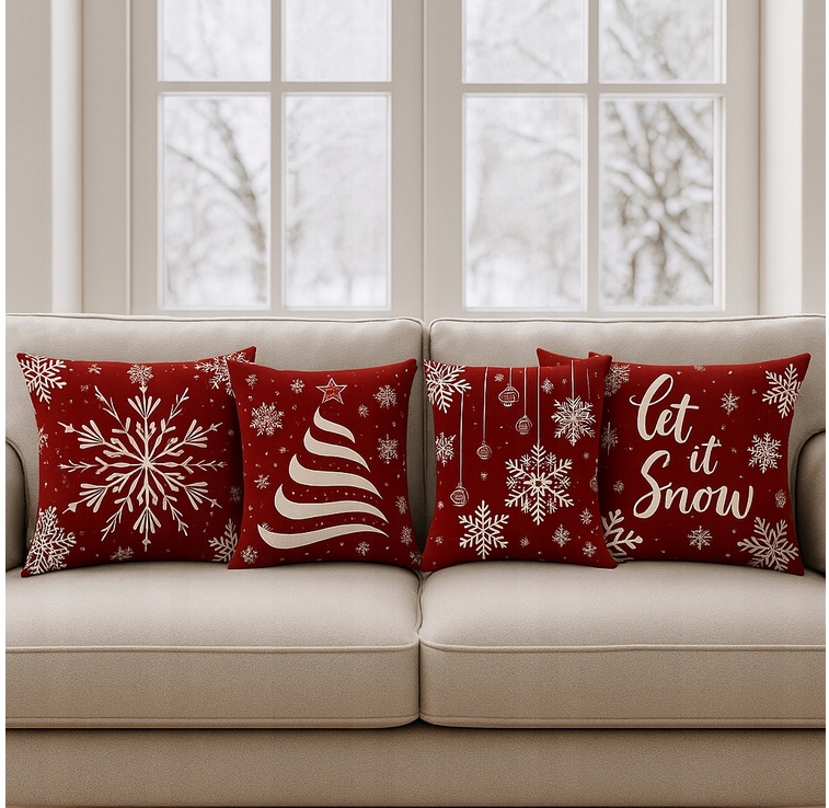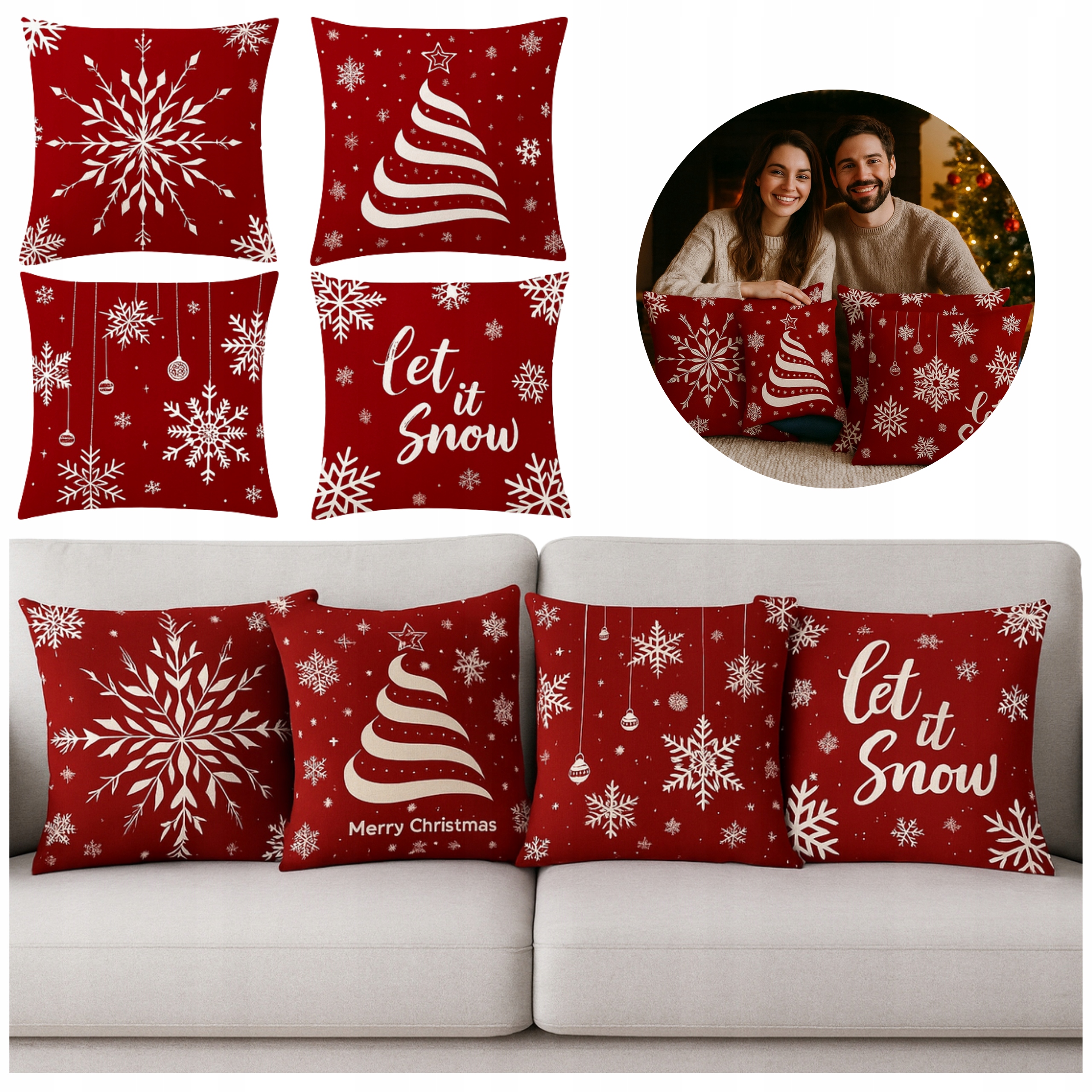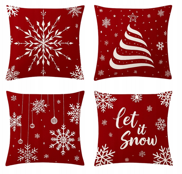 Zestaw czterech dekoracyjnych poszewek w klasycznej czerwono-beżowej kolorystyce to idealne połączenie elegancji, przytulności i świątecznej magii. Delikatne wzory choinek, śnieżynek, bombek i napis „Let it Snow” dodadzą wnętrzu ciepła i uroku, tworząc wyjątkową atmosferę zimowych wieczorów.