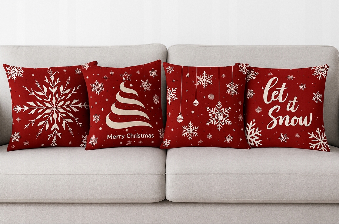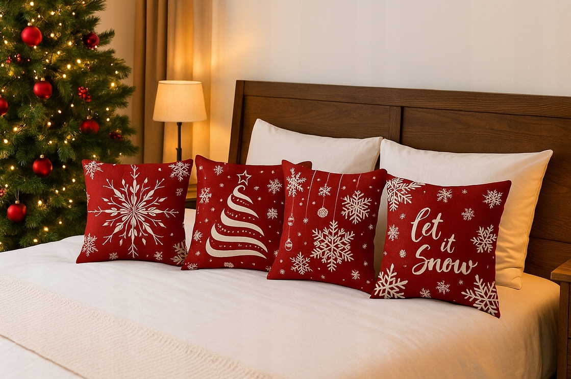 Zestaw czerwono-beżowych poszewek to stylowa i trwała dekoracja, która odmieni każde pomieszczenie. Spraw, by Twój dom wypełnił się świątecznym ciepłem, radością i elegancją, którą pokochają wszyscy domownicy i goście.
