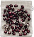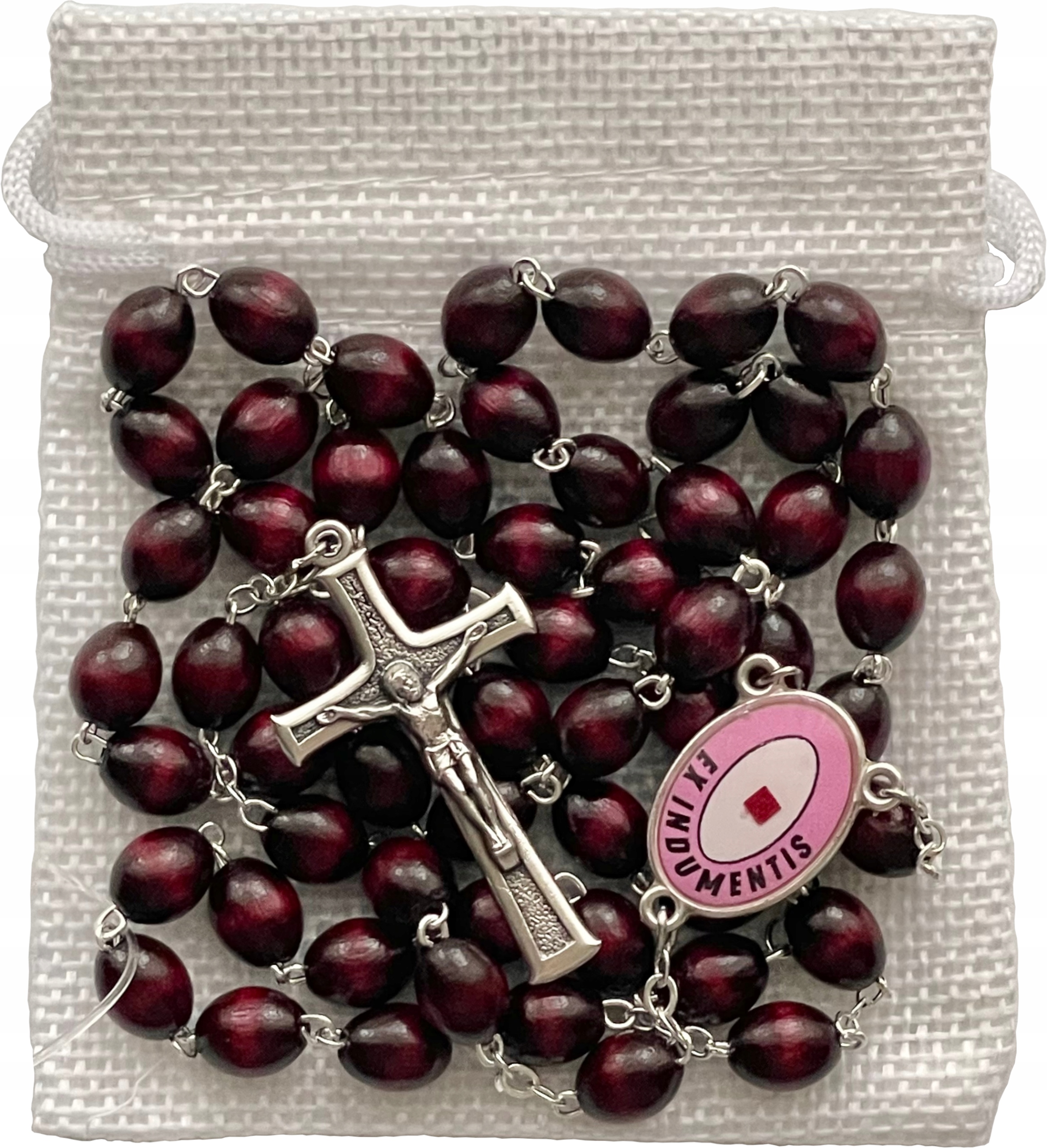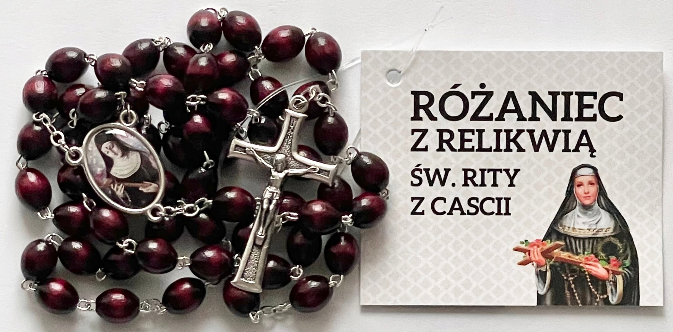 Różaniec drewniany (orzech) w kolorze bordowym z relikwią św. Rity z Cascii z załączonym certyfikatem autentyczności zapakowany w jutowy woreczek z wizerunkiem św. Rity