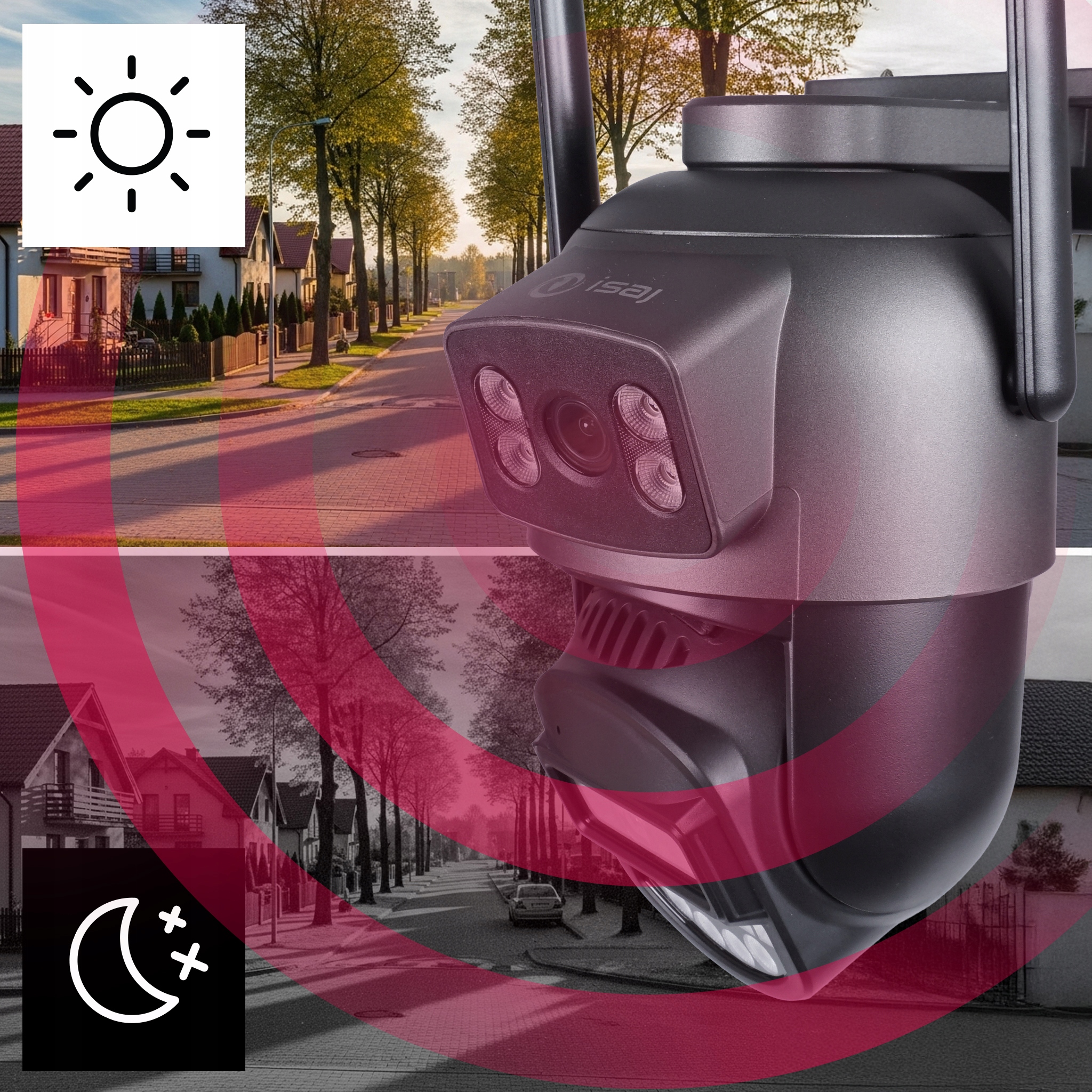 Kamera ISAJ SE1 dba o bezpieczeństwo 24/7, również po zmroku. Dzięki zaawansowanej technologii doświetlania, żaden ruch nie umknie Twojej uwadze: