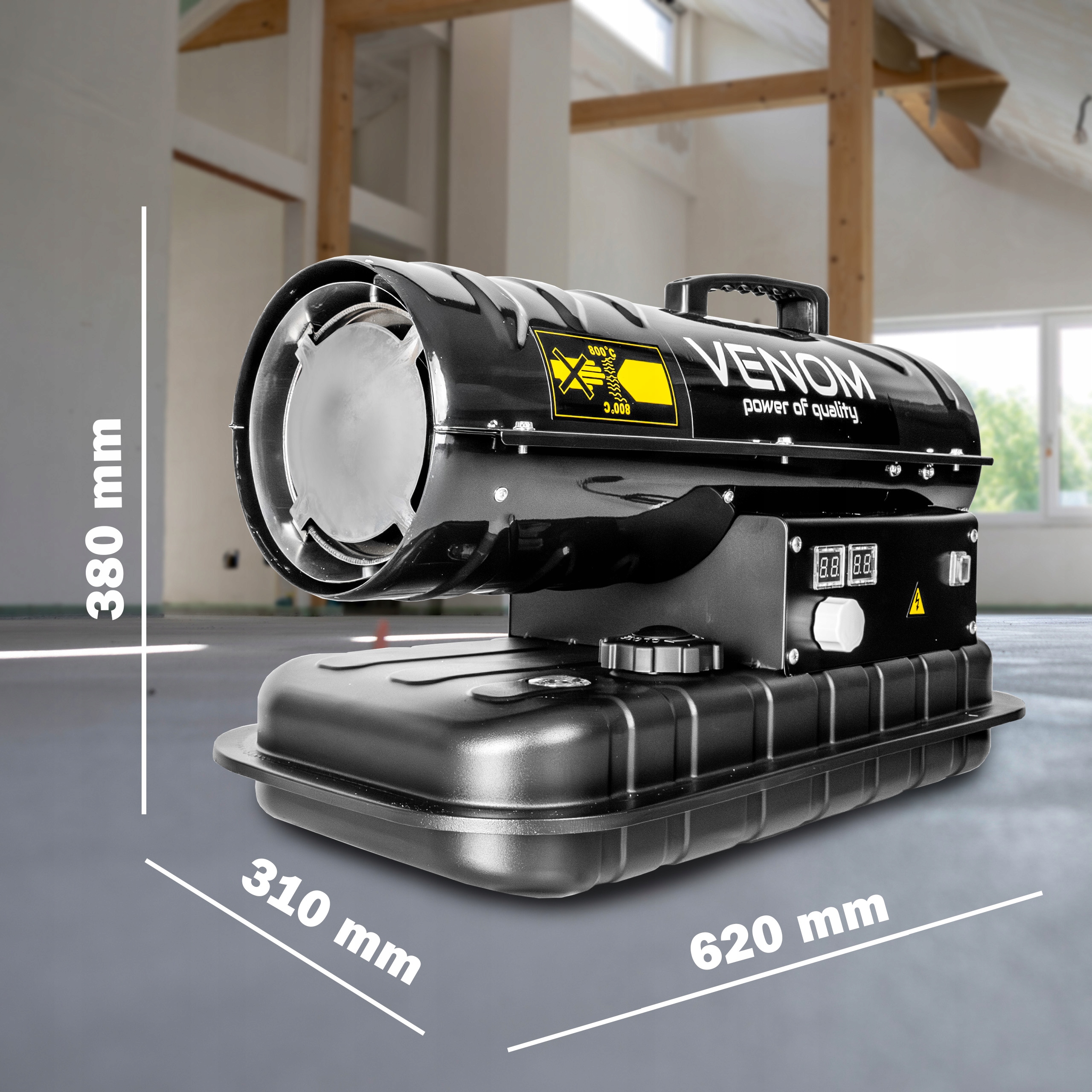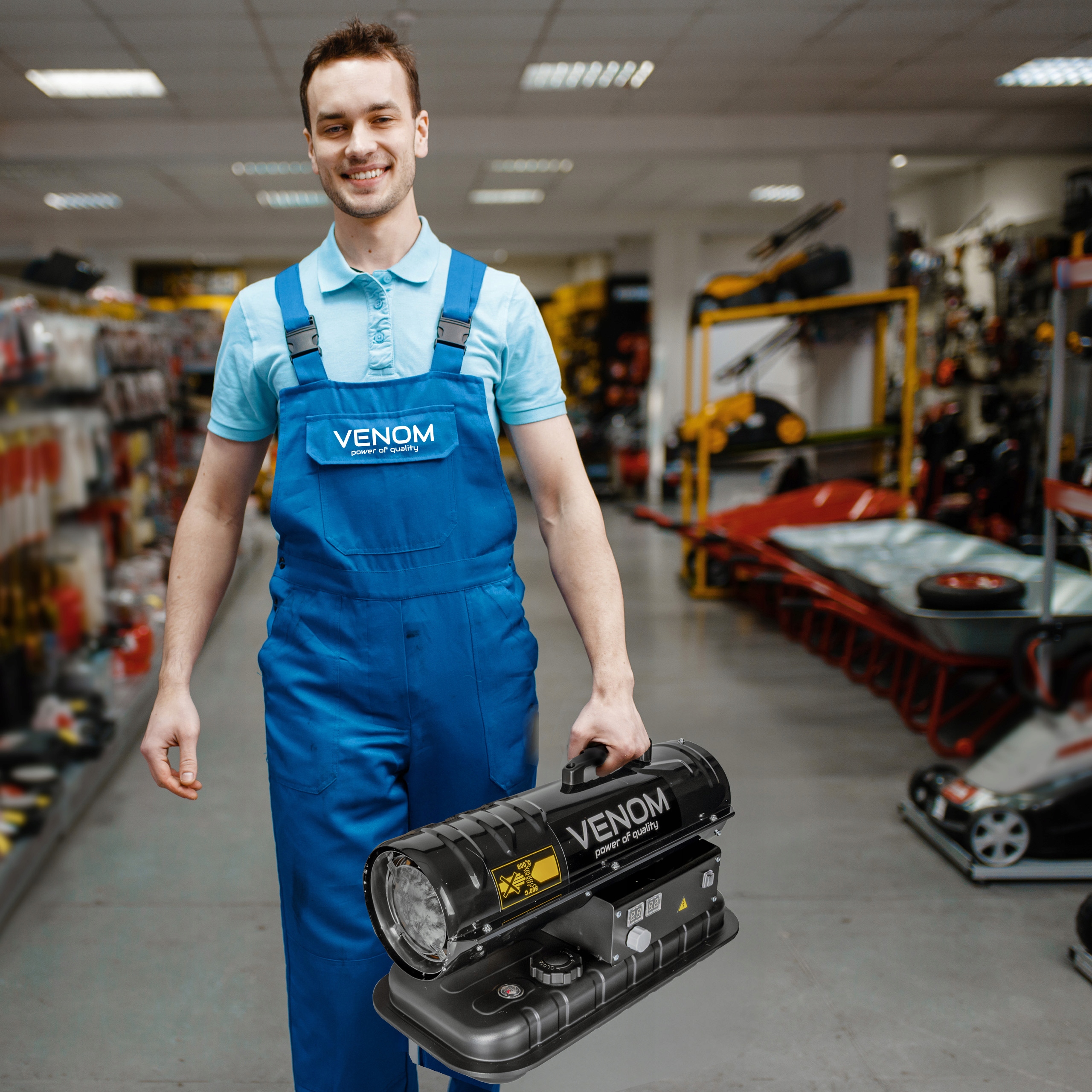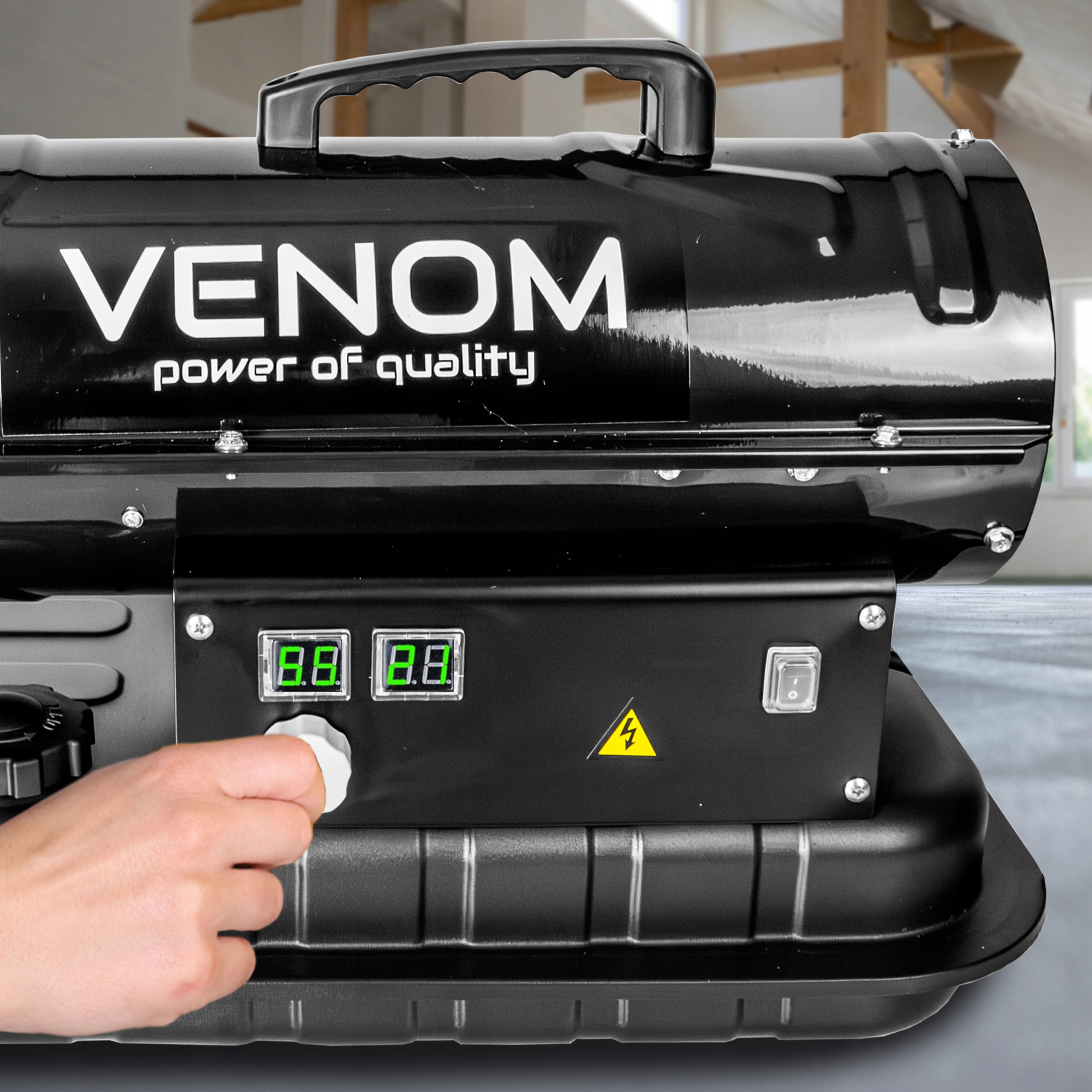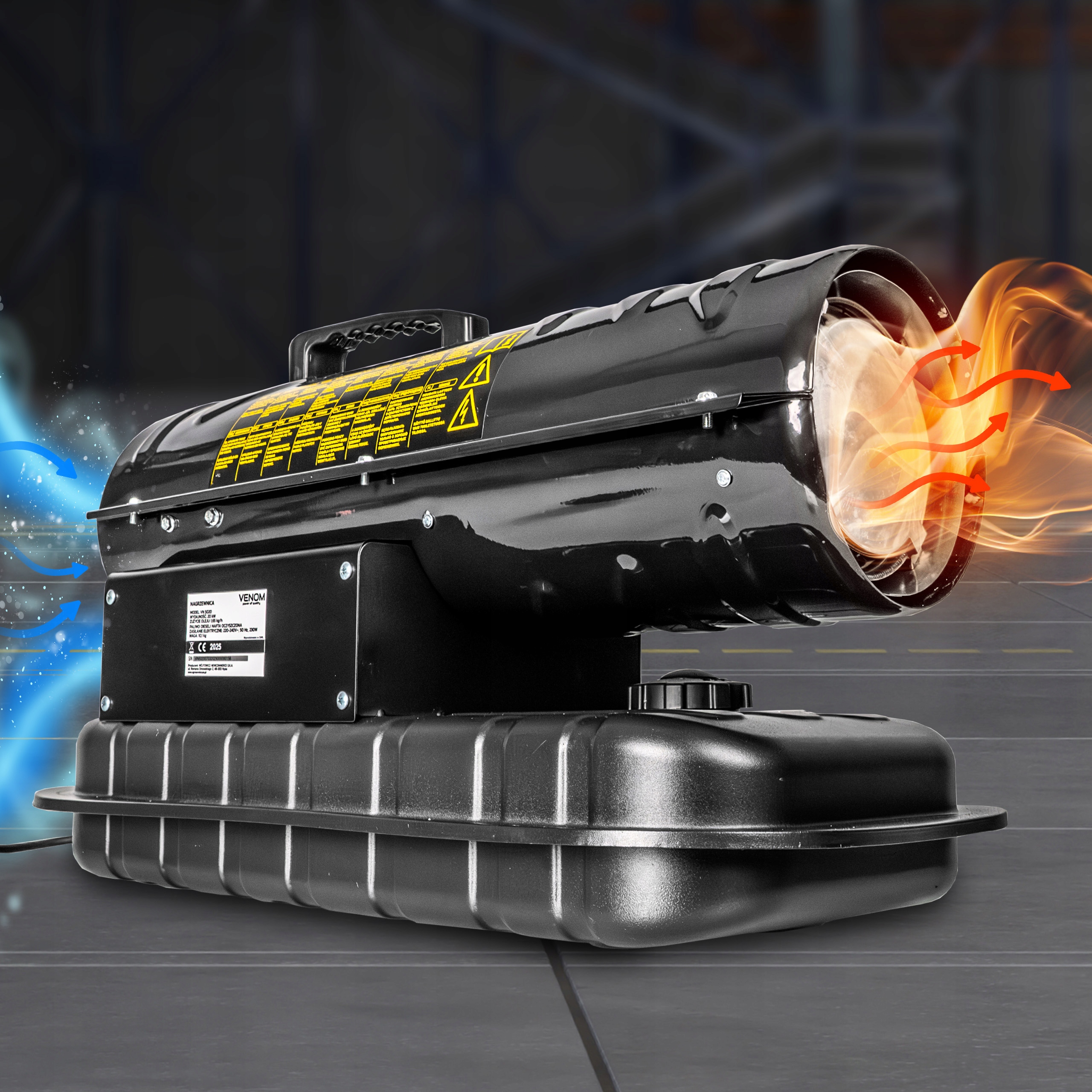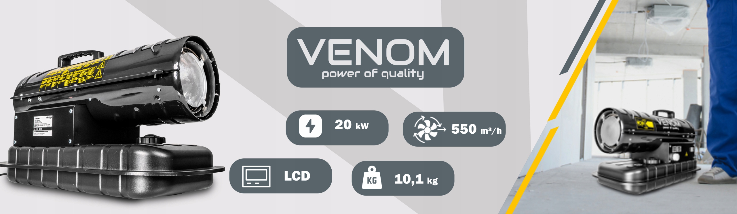 ✅ VENOM PowerHeat 20kW™ – nagrzewnica olejowa o mocy 20 000 W, która w kilka minut podnosi temperaturę w pomieszczeniu, zapewniając szybkie i efektywne ogrzewanie hal, warsztatów, magazynów i garaży.