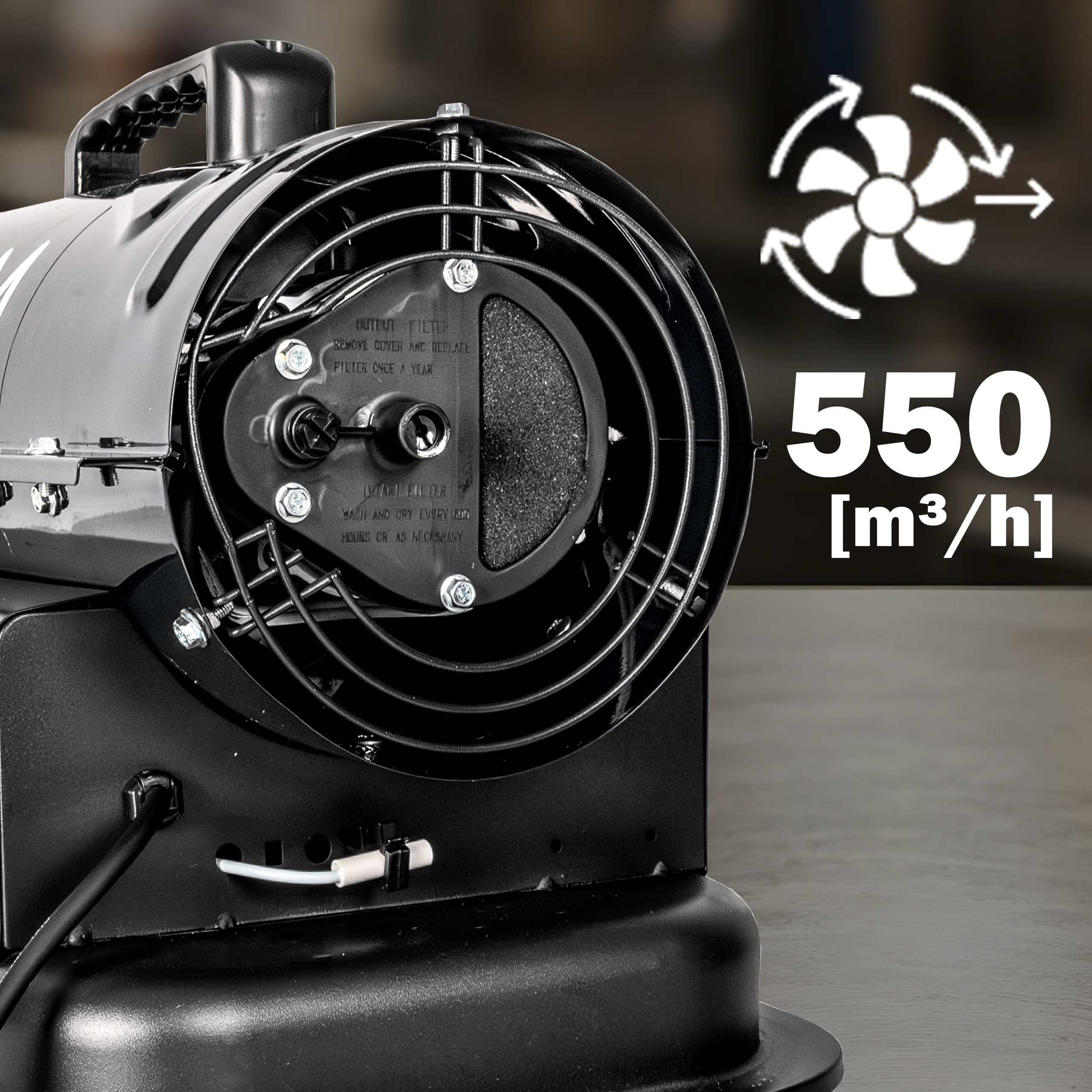 Nagrzewnica wyposażona jest w 5-łopatkowy wentylator o przepływie 550 m³/h, który gwarantuje równomierne i szybkie rozprowadzanie ciepła w dużych przestrzeniach roboczych.