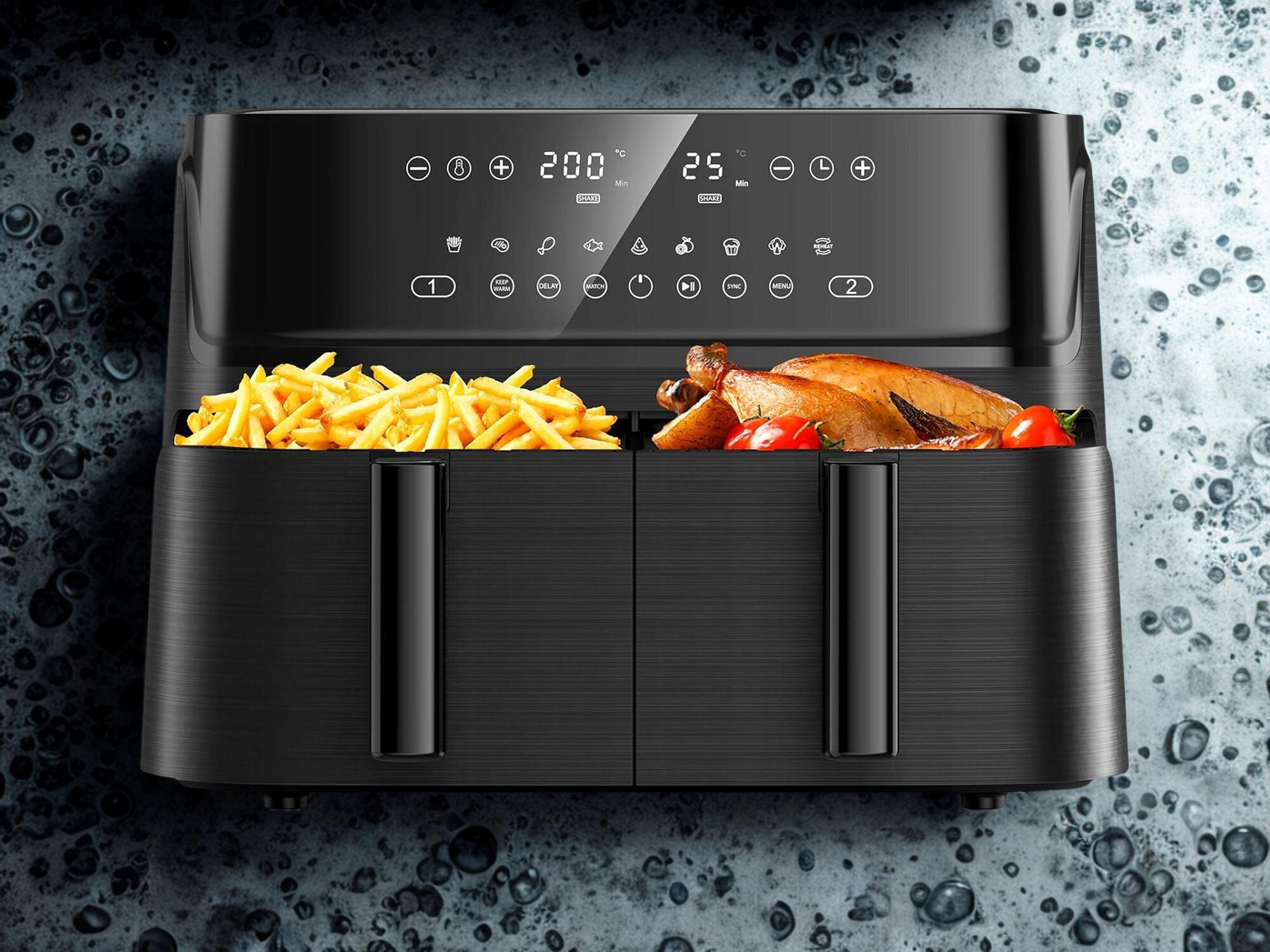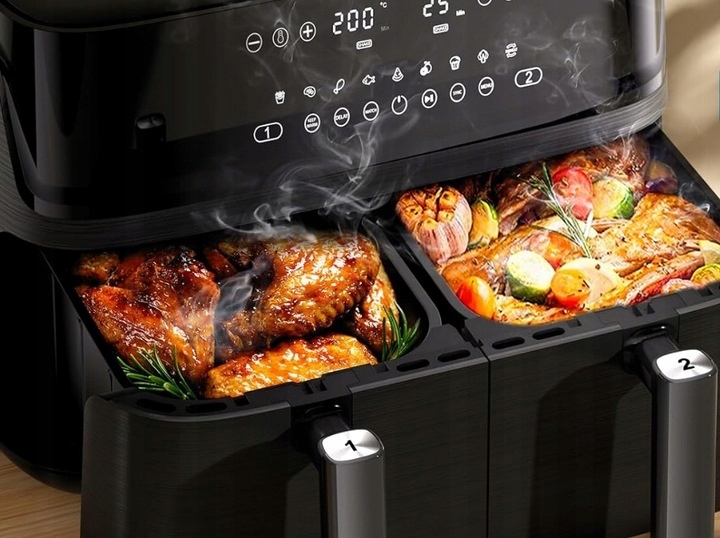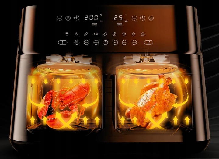 Ta Frytkownica na Gorące Powietrze JYMIPA Dual Zone 10L to rewolucja w zdrowym gotowaniu. Wyposażona w dwie niezależne komory (2 x 5L), pozwala na jednoczesne przygotowanie dwóch różnych dań w różnych temperaturach i czasach. Technologia przepływu powietrza 360° zapewnia chrupiące rezultaty przy użyciu 85% mniej tłuszczu niż w tradycyjnym smażeniu. Gotuje o 50% szybciej niż konwencjonalny piekarnik i oszczędza do 70% energii. Intuicyjny, cyfrowy ekran dotykowy oferuje 10 gotowych programów (w tym suszenie, podgrzewanie i utrzymywanie ciepła). Idealna dla rodzin 6-10 osobowych, dzięki funkcji SYNC COOK masz pewność, że obie potrawy będą gotowe w tym samym czasie.