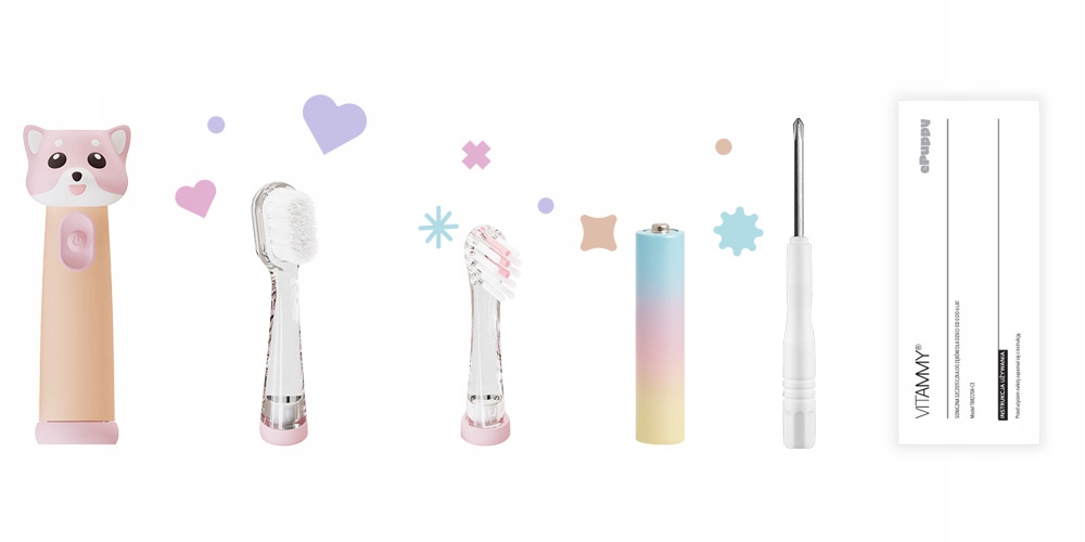 Skład zestawu: Szczoteczka soniczna Vitammy ePuppy; Końcówka NANO; Końcówka NOVA; Bateria AAA; Śrubokręt; Instrukcja obsługi.