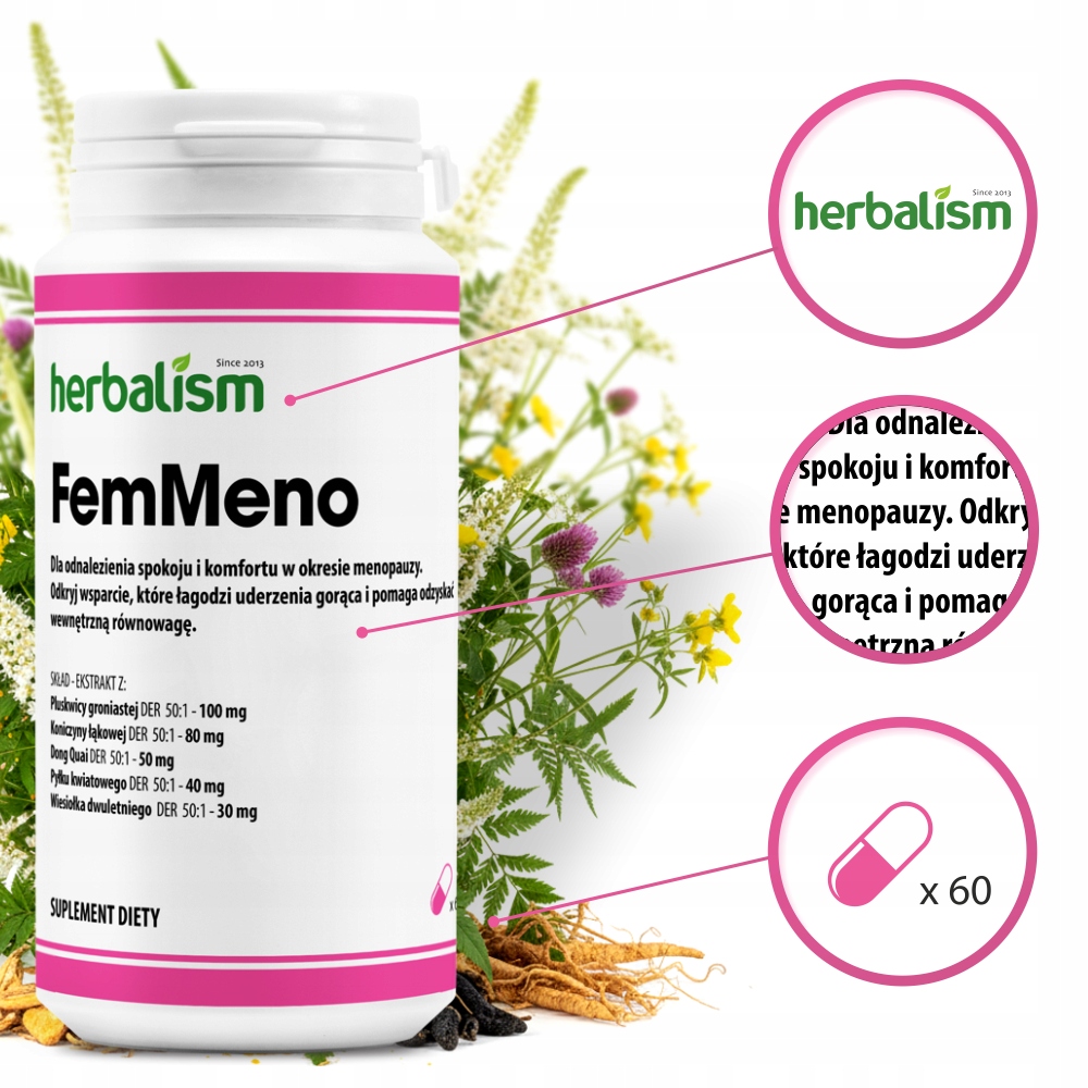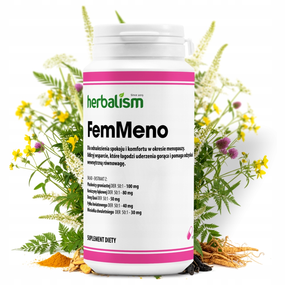 Uderzenia gorąca przejmują kontrolę nad Twoim dniem? Czujesz, że własne emocje i ciało płatają Ci figle? FemMeno to suplement stworzony, by przywrócić Ci komfort i wewnętrzną harmonię. To precyzyjnie dobrana kompozycja 5 najskuteczniejszych ekstraktów roślinnych o maksymalnej mocy (DER 50:1), która realnie odpowiada na najbardziej uciążliwe objawy menopauzy.