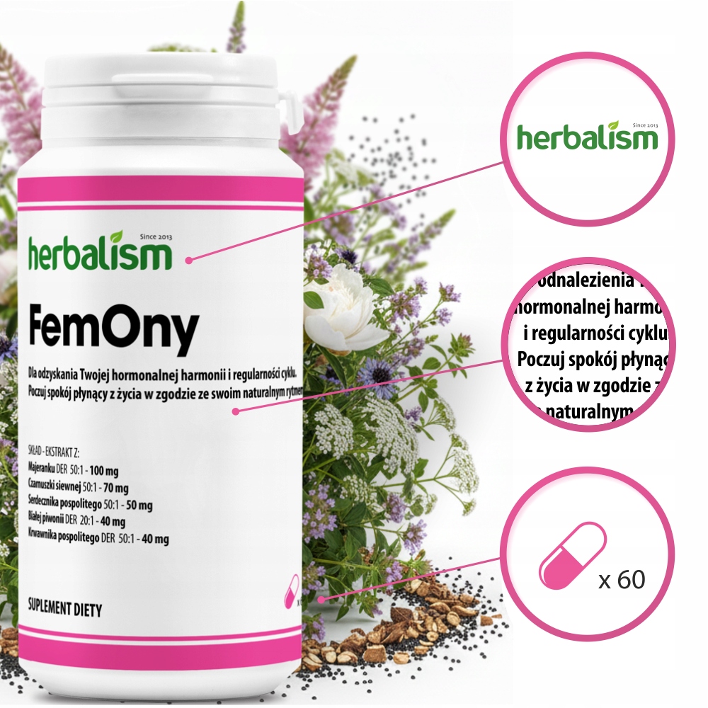 Nieregularne cykle, wahania nastroju, problemy z cerą i brak energii to sygnał, że Twój organizm potrzebuje wsparcia. FemOny to holistyczna kompozycja pięciu ekstraktów ziołowych, stworzona z myślą o kompleksowym wsparciu kobiecego układu hormonalnego, abyś mogła cieszyć się pełnią sił i dobrym samopoczuciem przez cały miesiąc.