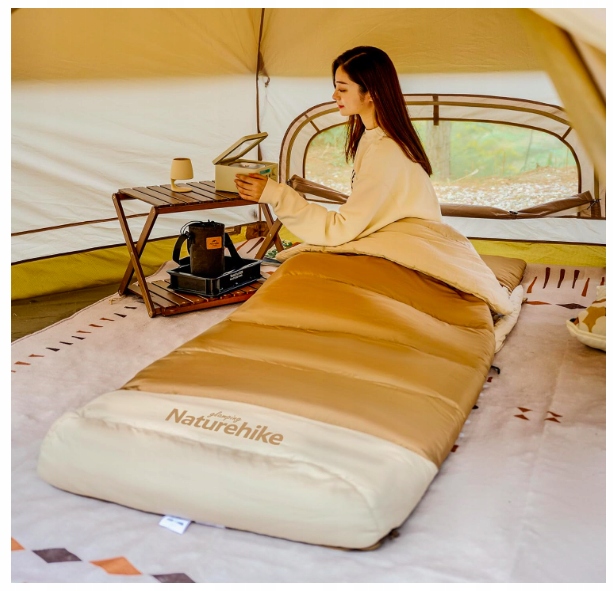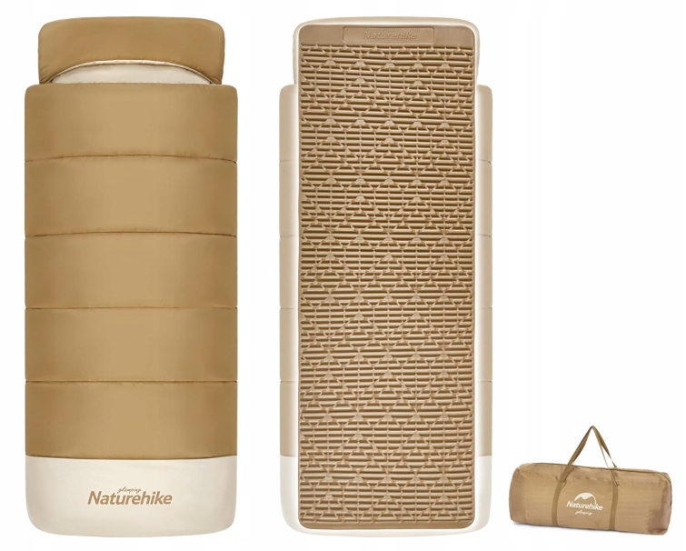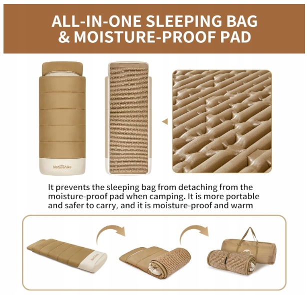 Śpiwór Naturehike łączy w sobie matę piankową i śpiwór bawełniany w jednej konstrukcji. Dzięki temu zajmuje mniej miejsca, jest łatwy w przechowywaniu i transporcie.