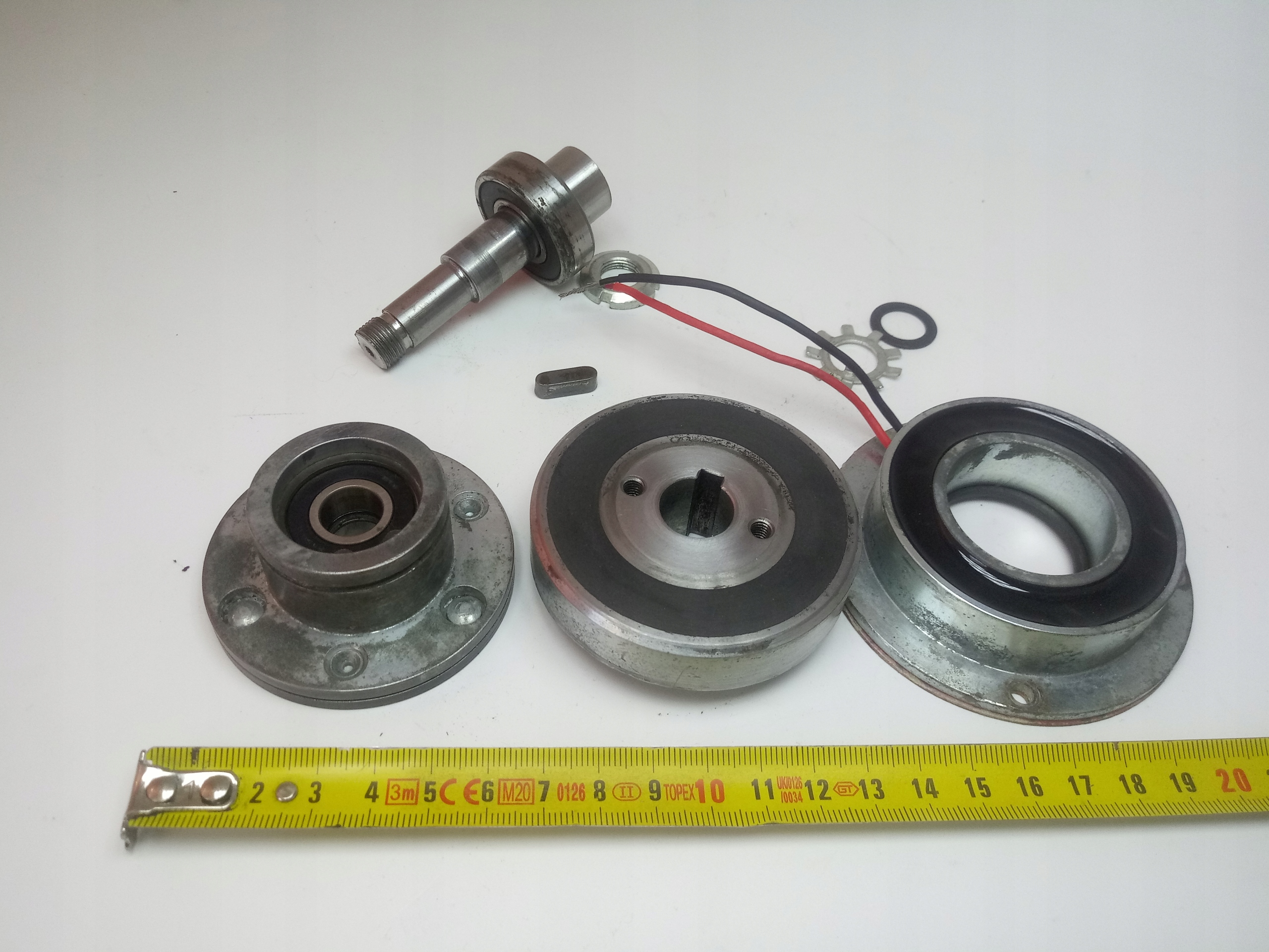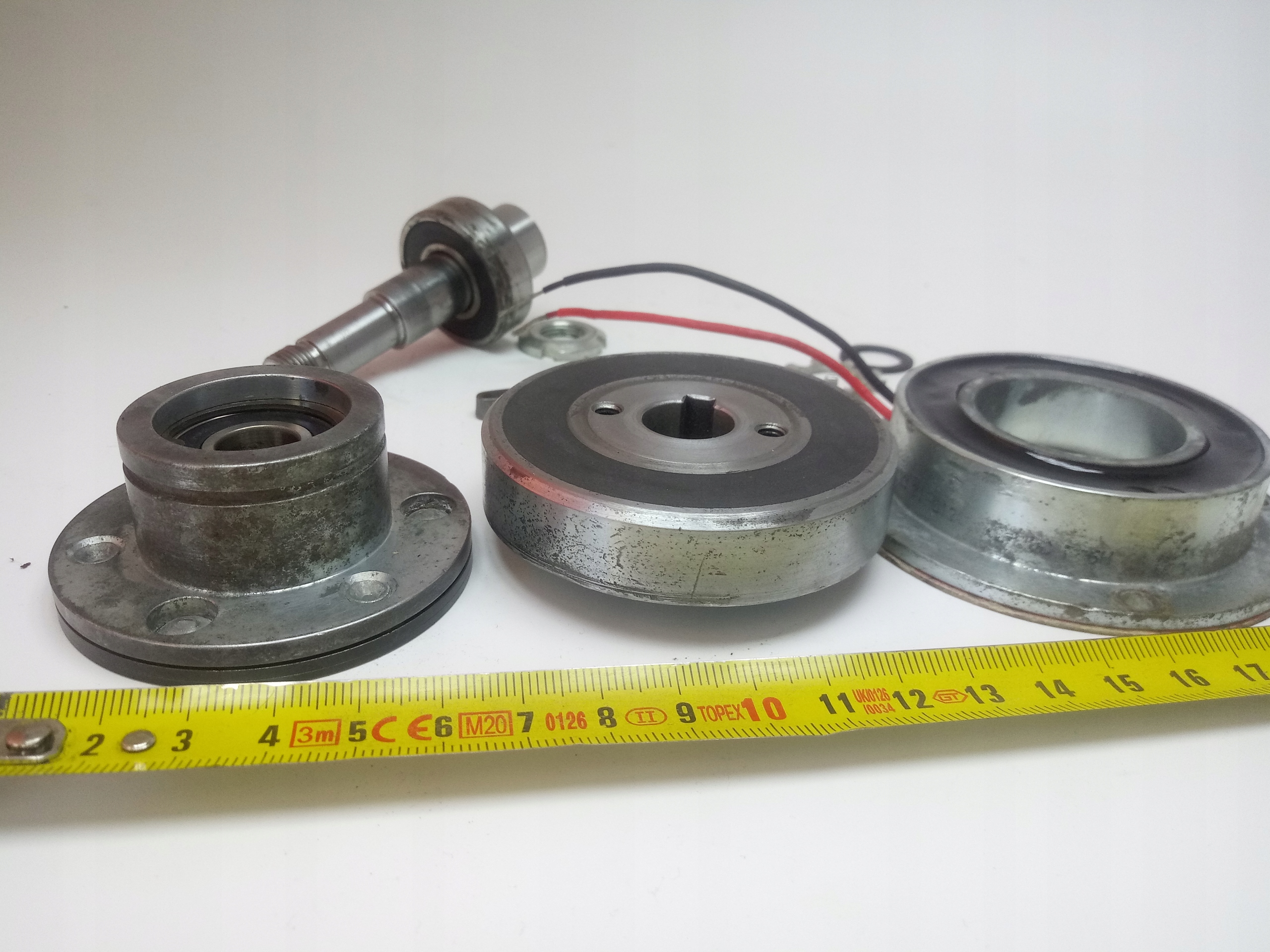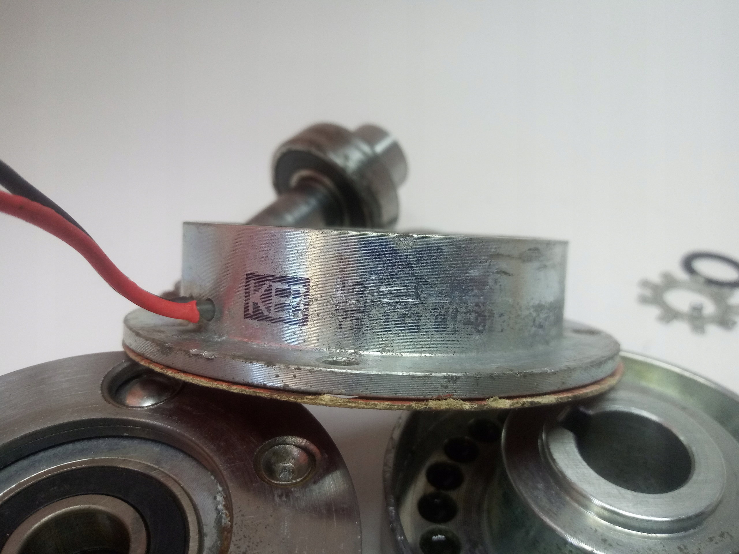 Elektrosprzęgło KEB, model 75.143.01-0121, zasilane napięciem 12V DC, moc 6W, średnica tarczy ciernej zasprzęglającej Fi63mm, wysokość całkowita elektrosprzęgła 50mm, w zestawie ucięty wałek i wszystko co na zdjęciach, elektrosprzęgło przetestowane sprawne