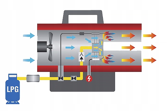 - wentylator umieszczony z tyłu nagrzewnicy pcha powietrze wokół komory spalania zapewniając jego natychmiastowe ogrzanie.