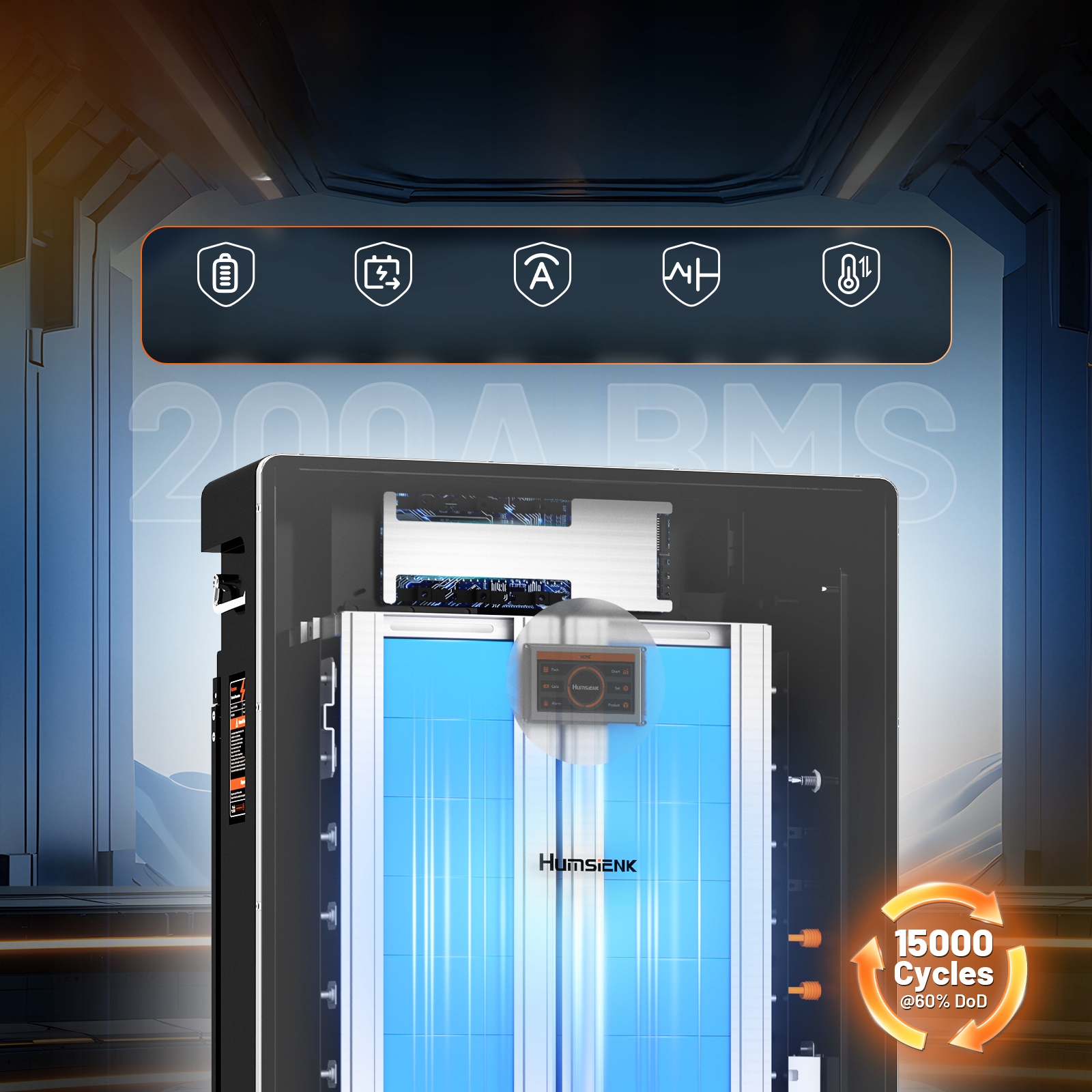 Wbudowany inteligentny system zarządzania baterią (BMS) 200A ⚡ wraz z wyłącznikiem nadprądowym i solidną metalową obudową zapewnia: