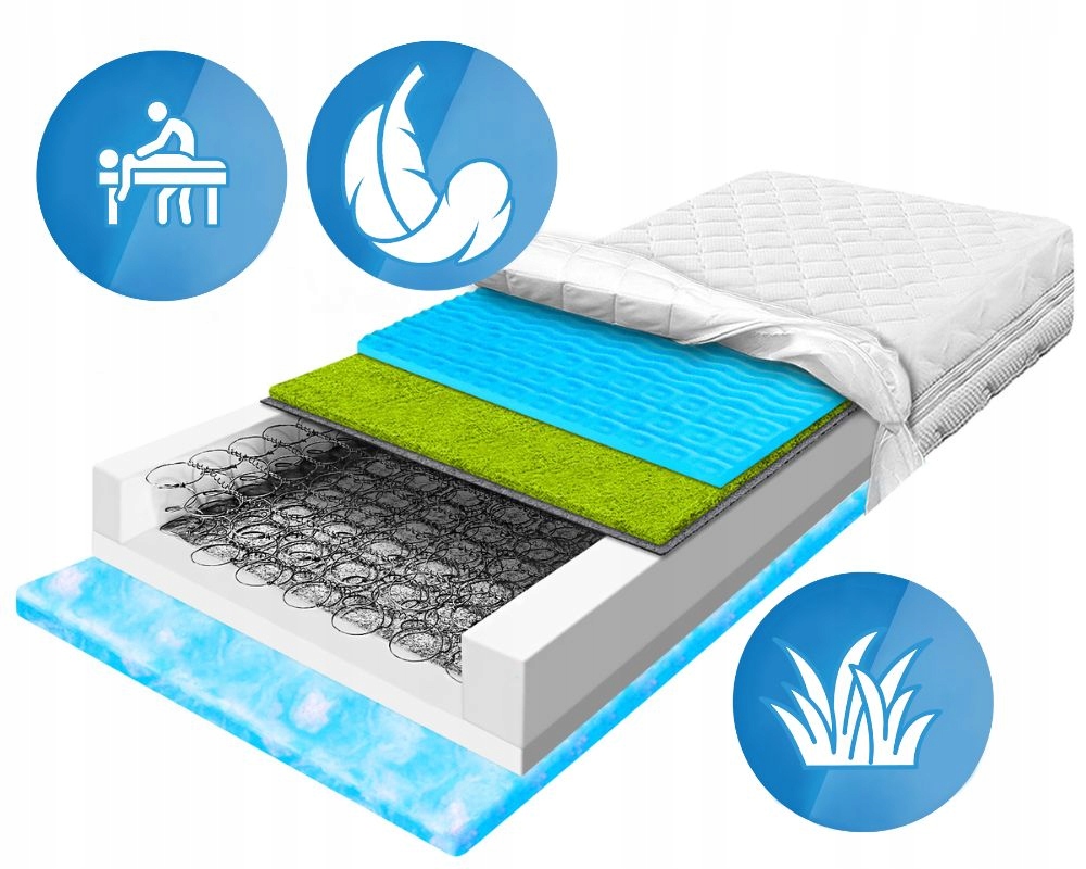 Zestawienie trawy morskiej z pianką masującą Blue to doskonałe połączenie stabilnego wsparcia i uczucia relaksu. Trawa morska wzmacnia konstrukcję materaca, zapewniając lepsze podparcie kręgosłupa, natomiast pianka z wypustkami subtelnie stymuluje ciało, wspomagając krążenie i odprężenie. Razem tworzą komfortową powierzchnię, idealną do regenerującego snu.