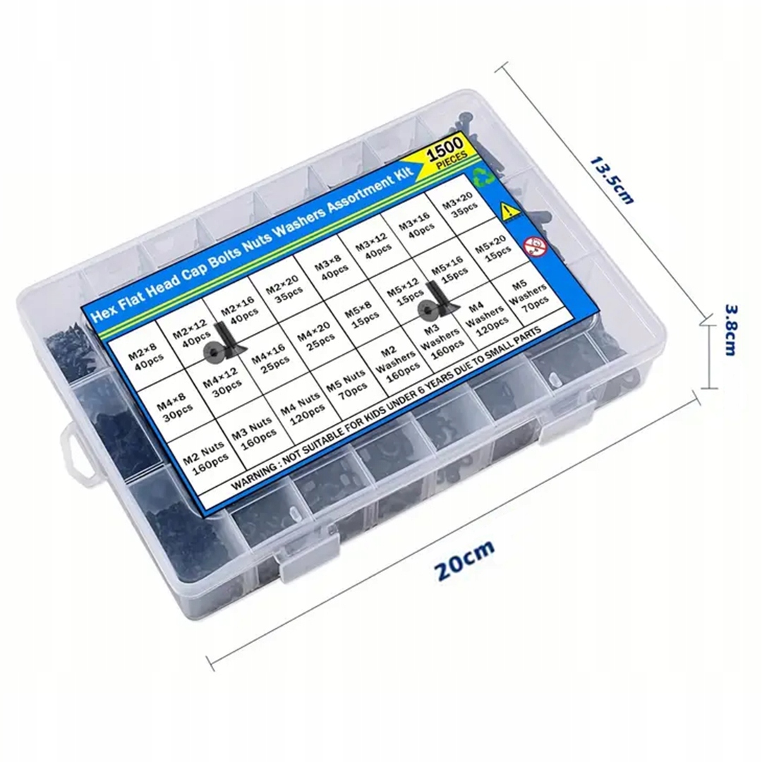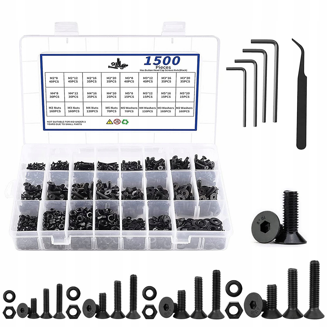 Łącznie 1500 elementów — każdy rozmiar starannie oznaczony i posegregowany, byś zawsze wiedział, po co sięgasz.