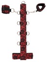 Cechy produktu: Obroża oraz kajdanki wykonane z czerwonej satyny i czarnej koronki Wewnętrzna część wykończona miękkim czarnym aksamitem Regulowane zapięcia na rzepy Stabilny mostek pierścieniowy i karabińczyki 100% poliester Kolor: czerwono-czarny
